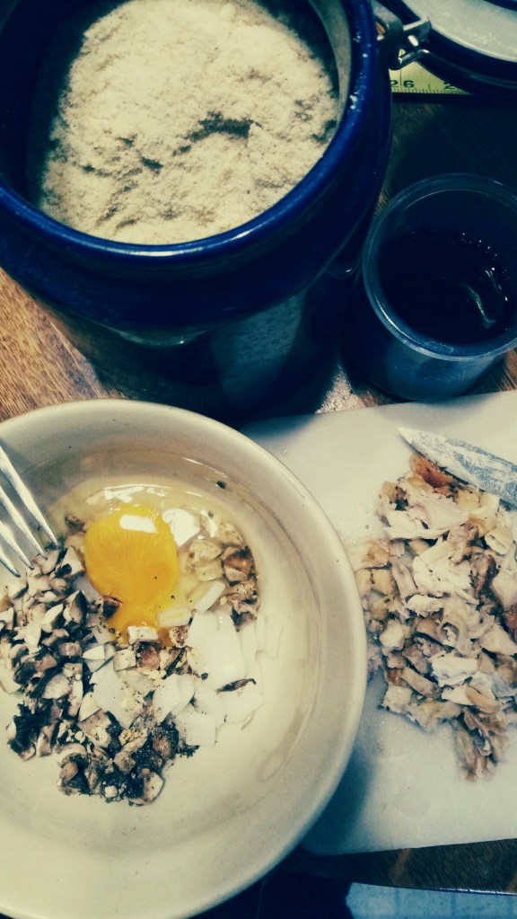 I pulled chopped onion out of the fridge and tossed some in a bowl with some chopped mushrooms, egg, pepper, garlic and any other spices you like. Worcestershire sauce is nice, as is a dash of wine. If you want to make enough for 4, use 2 eggs and more stuff. If you end up with too much for the number of burgers you need either make a spare for tomorrow’s lunch or fry it up and give it to the dog or chickens.