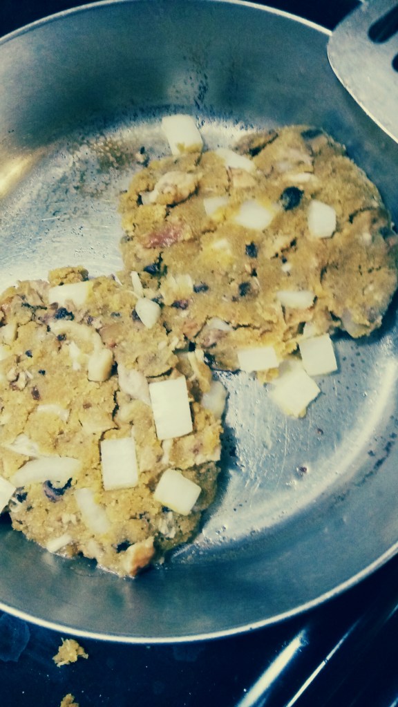 Add enough bread crumbs to make a pasty mess that you can form into a burger or two…or more, depending on how much stuff you threw into the bowl in the first place.