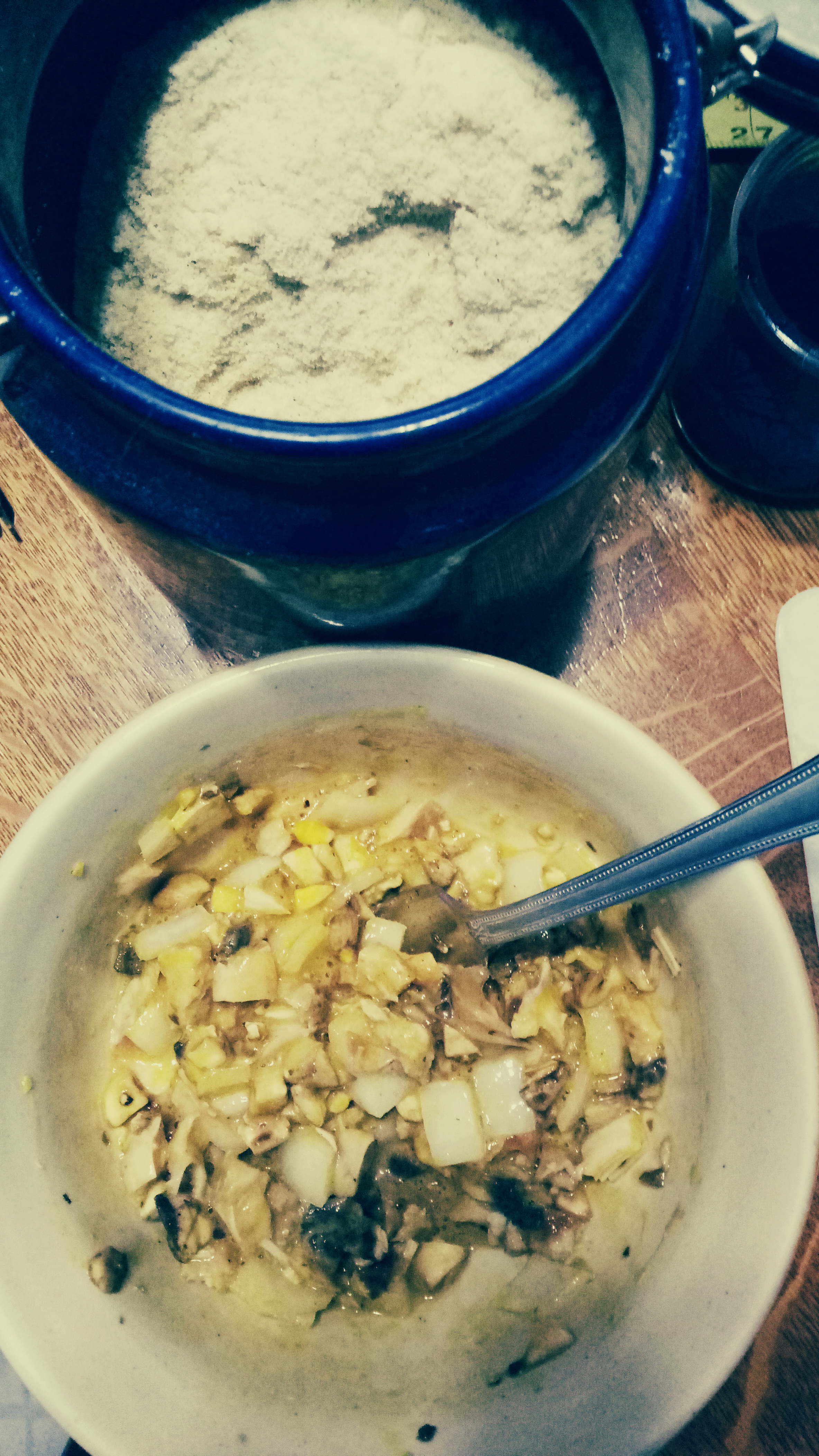 I pulled chopped onion out of the fridge and tossed some in a bowl with some chopped mushrooms, egg, pepper, garlic and any other spices you like. Worcestershire sauce is nice, as is a dash of wine. If you want to make enough for 4, use 2 eggs and more stuff. If you end up with too much for the number of burgers you need either make a spare for tomorrow’s lunch or fry it up and give it to the dog or chickens.