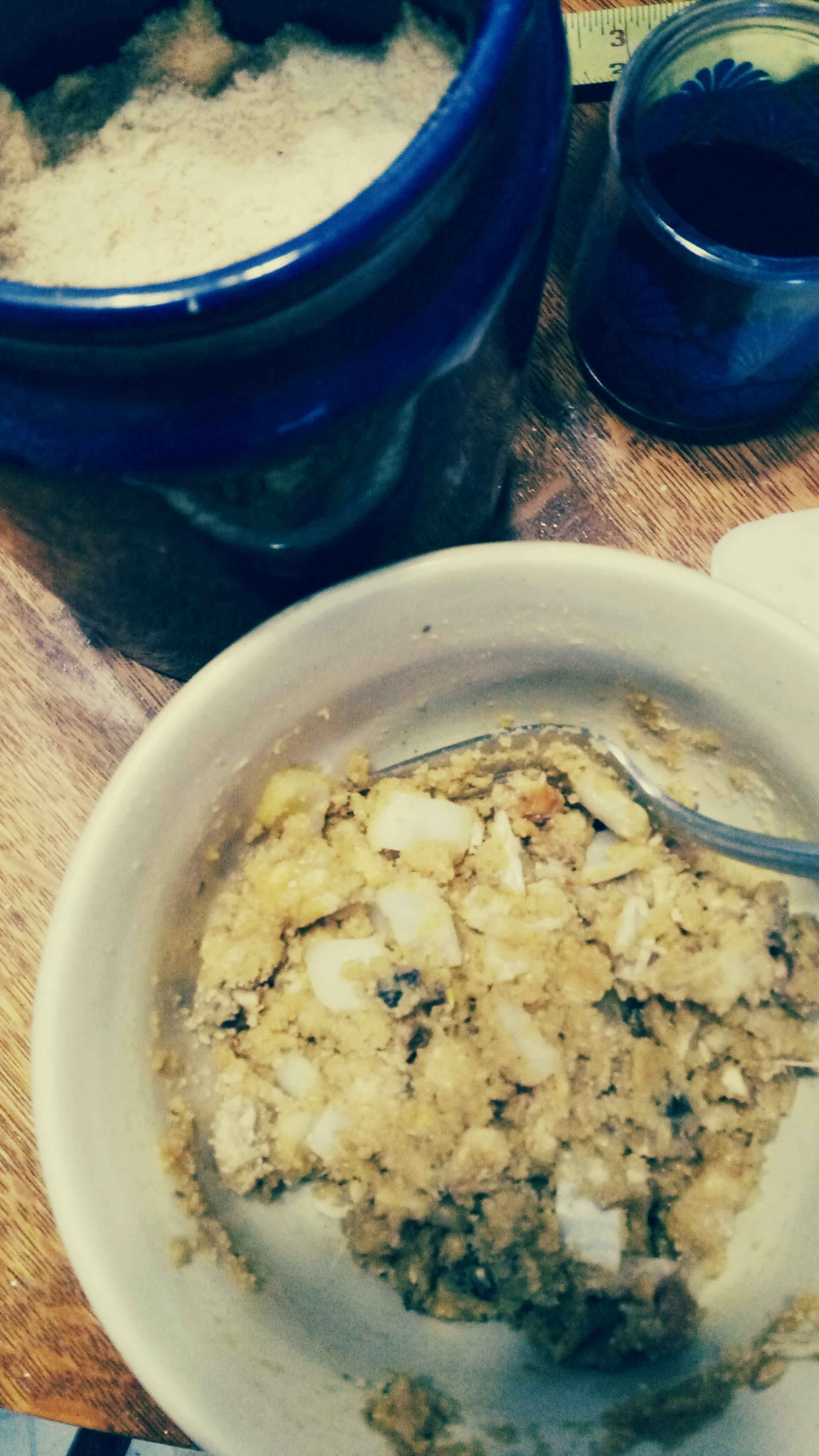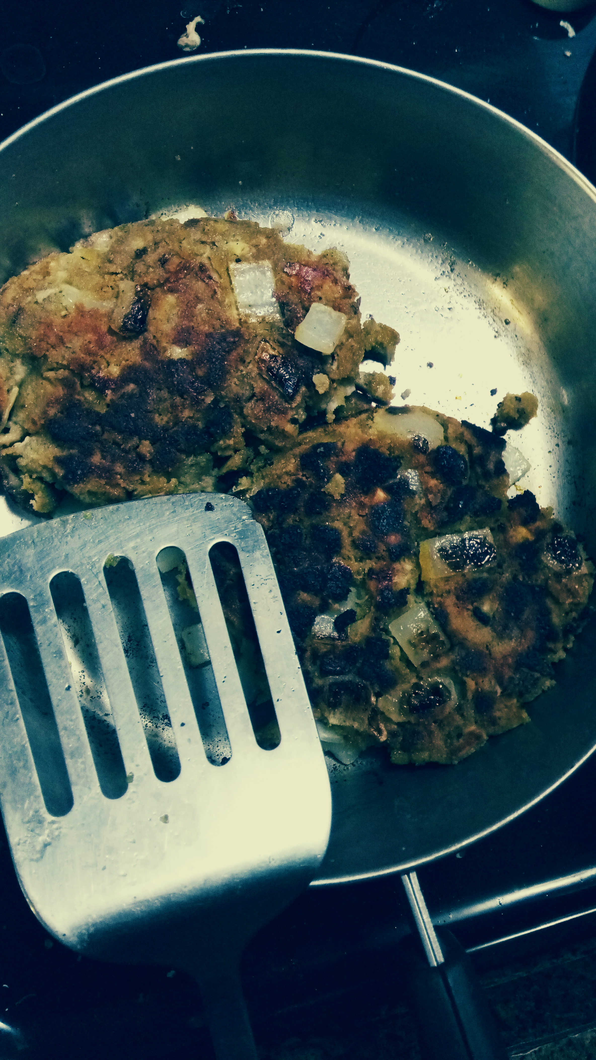 Add enough bread crumbs to make a pasty mess that you can form into a burger or two…or more, depending on how much stuff you threw into the bowl in the first place.