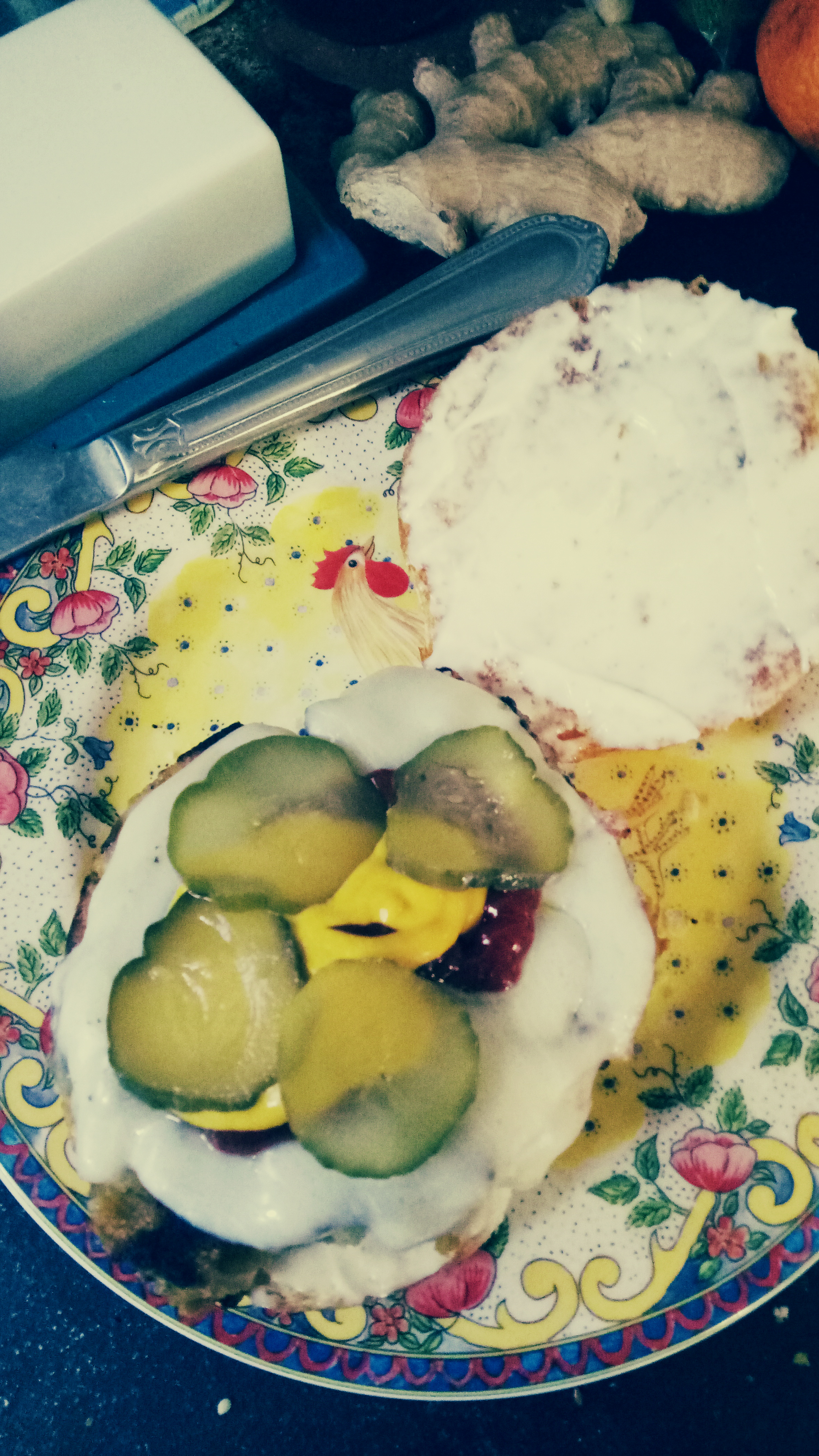 Carefully turn them when they’re brown, after a couple minutes on medium heat. Careful, they’re a bit more delicate than regular burgers, but they should be fine. If you want a cheeseburger now is the time to put a slice of cheese on. Cheddar, provolone, Gouda, Havarti, Swiss (especially if you’re using leftover ham!) are all nice.
