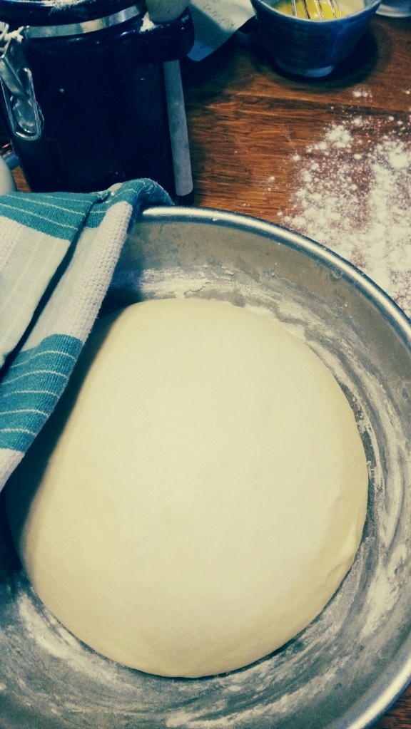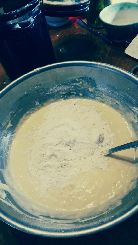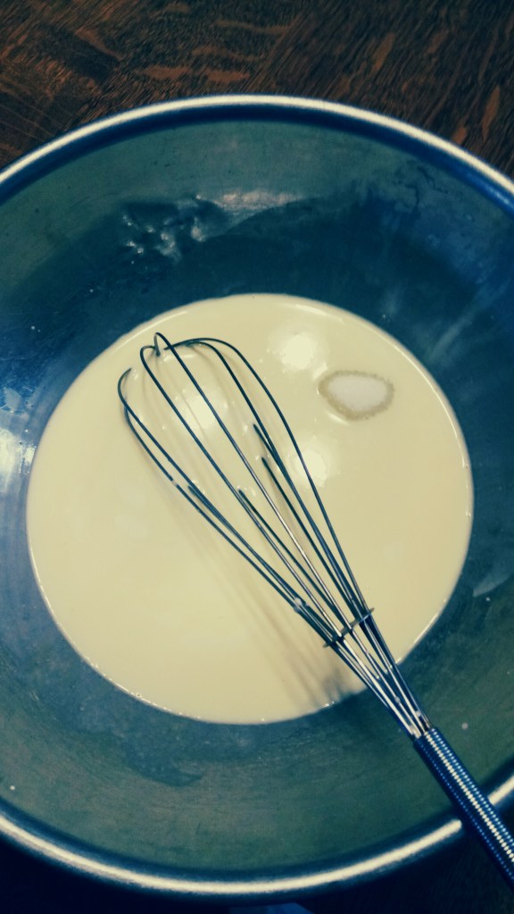 Mix together cream, milk, egg, sugar and yeast. A whisk is fine, but you’ll want to switch to a spoon after the first cup of flour is mixed in. If you start with the sugar you can use the same 1/3c measure for the sugar, cream and milk.