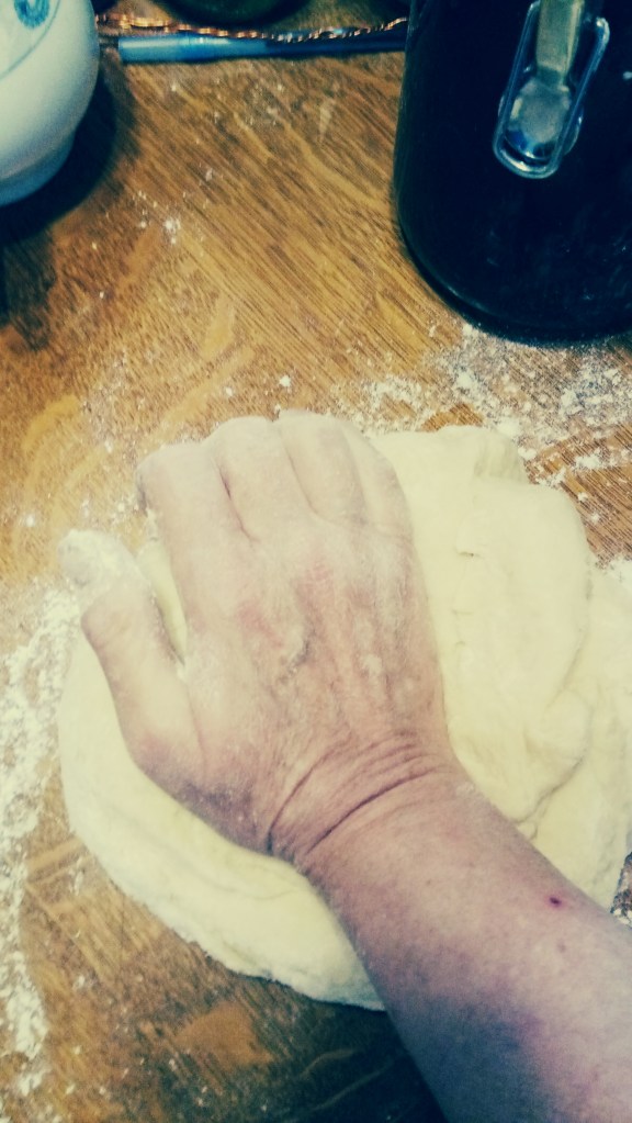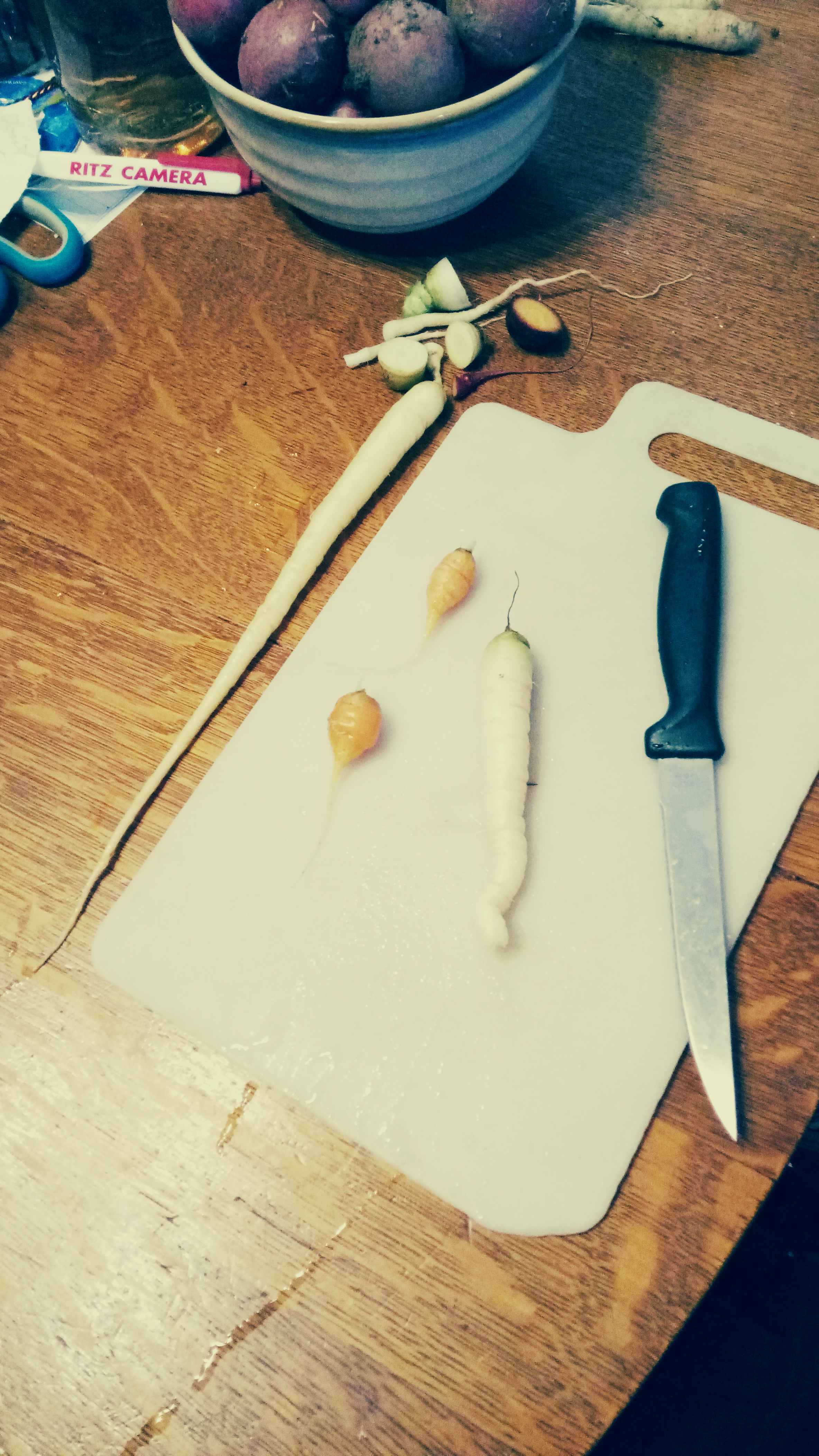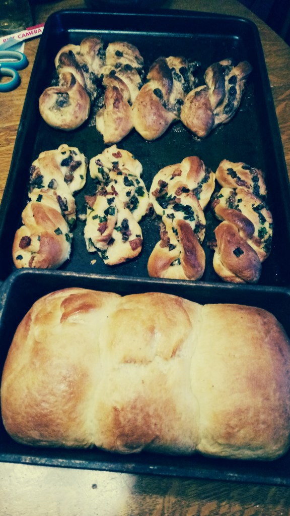 I saw this being made on a PBS cooking show and had to look it up. The dough is amazing to work with, forgiving and versatile. I found a recipe for Chinese Pork Sung Buns and used half the recipe to make those since their bread base sounded very similar and the Japanese Milk bread recipe I was following made half the recipe into unfilled buns anyway, so why not experiment? And while I was at it (and ran out of savory filling anyway) I experimented with a brown sugar cinnamon raisin dessert/breakfast version that I can’t wait to try. Dinner will be yummy tonight since while I was waiting for the first rise I put on a pot of cawl. I had to harvest some potatoes that got nipped in a cold snap so up came some carrots and turnips as well.
