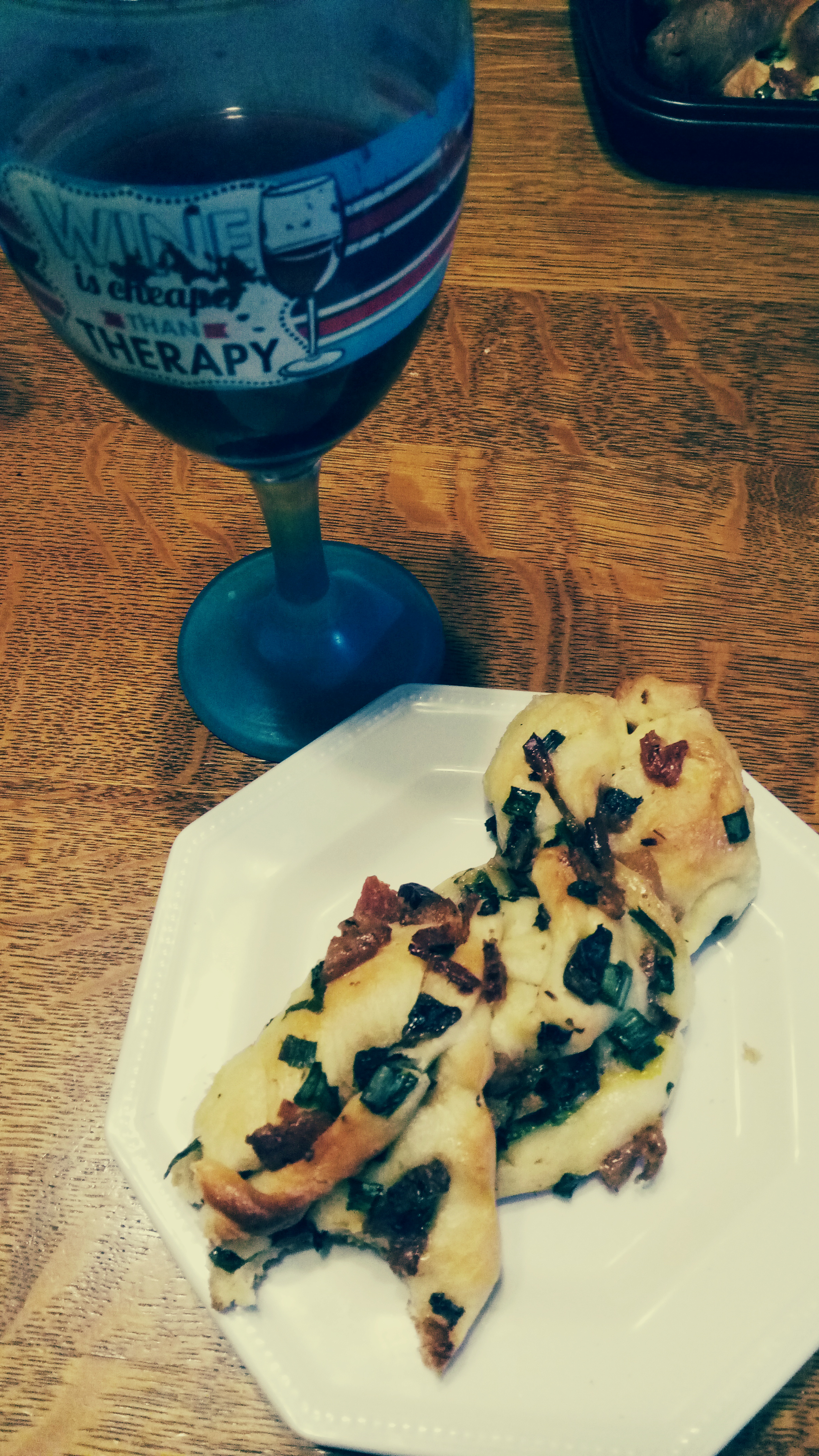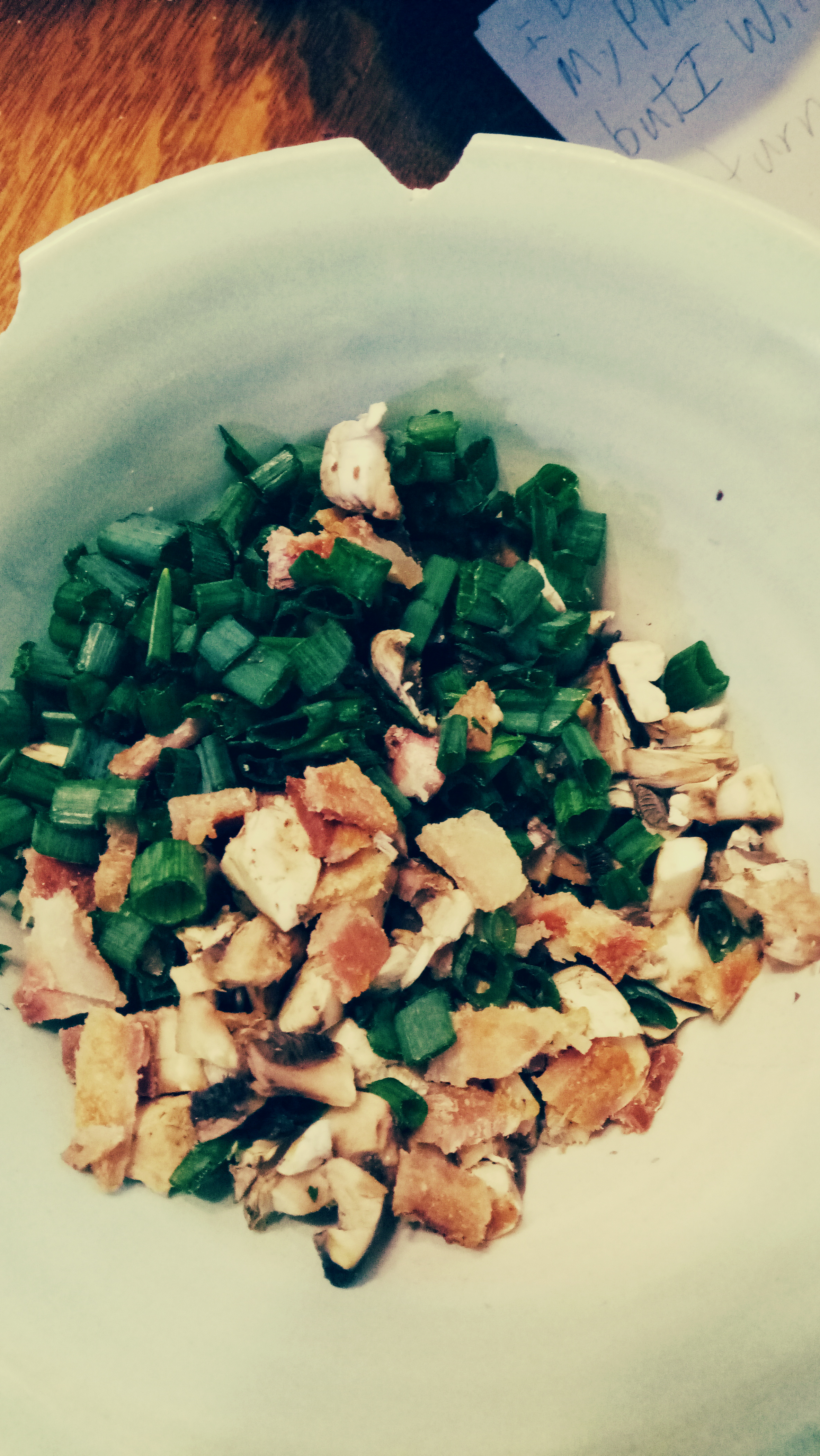I used a couple of pieces of cooked bacon, some onion greens and a few leftover mushrooms.