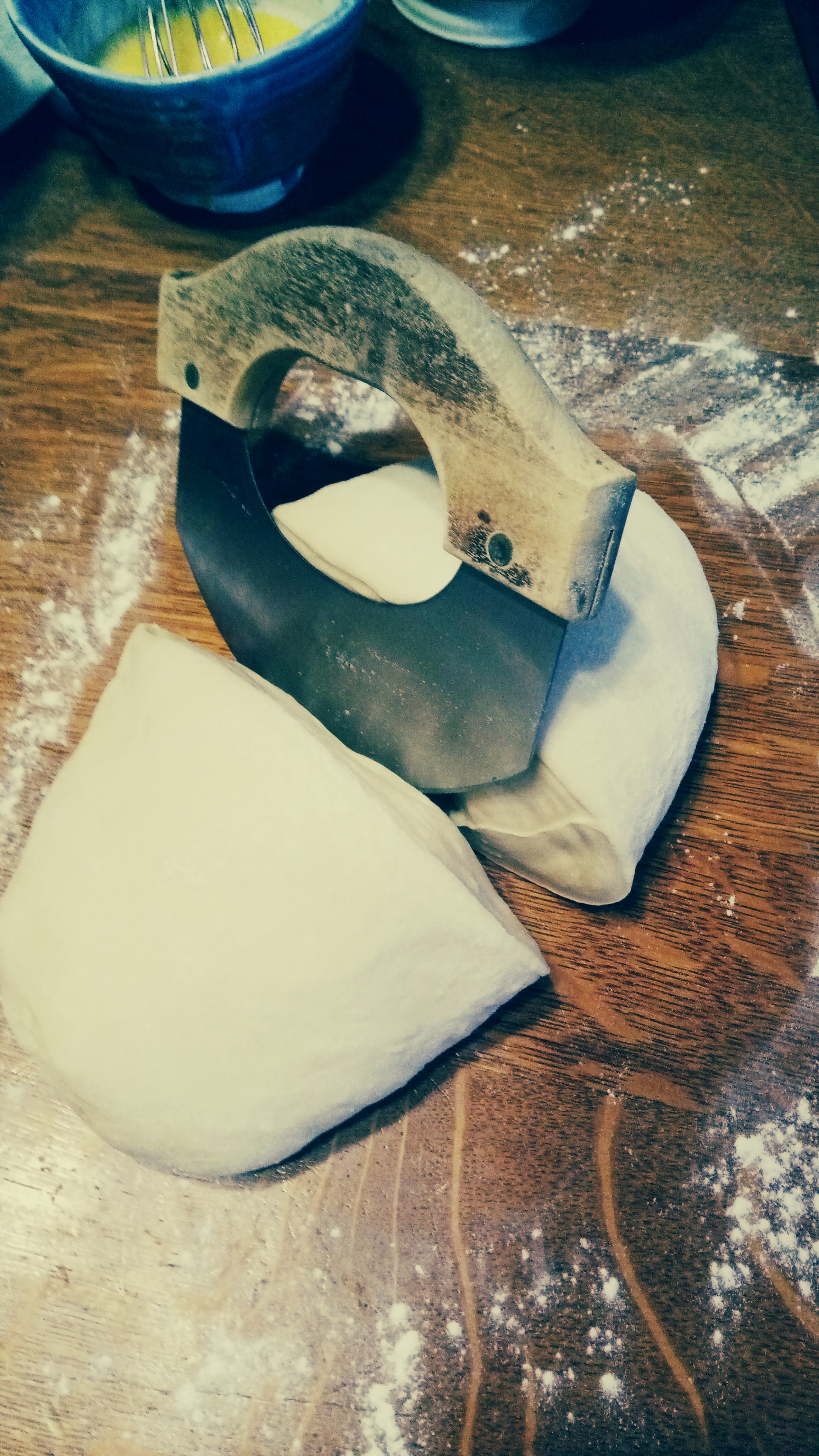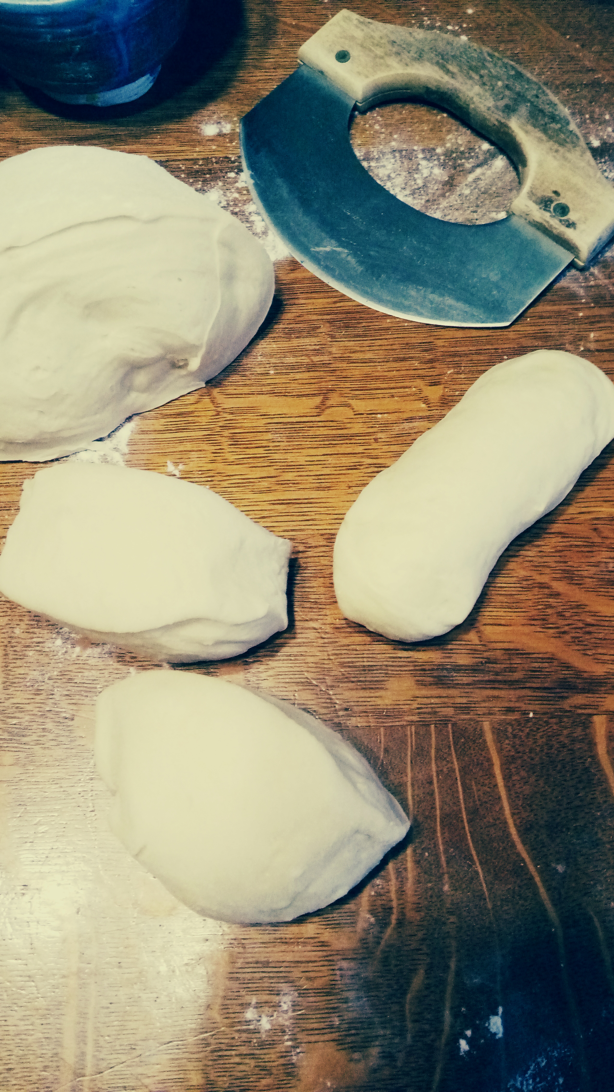 Turn it out onto a surface and knead about 5 minutes to even out all the structure then cut in half.