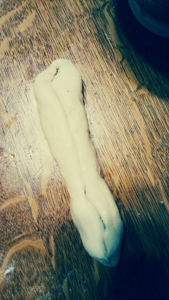 and cut mostly in half, leaving a bit at the top to hold it all together before twisting the cut bits filling-side up about 3 times over, pinching the ends together