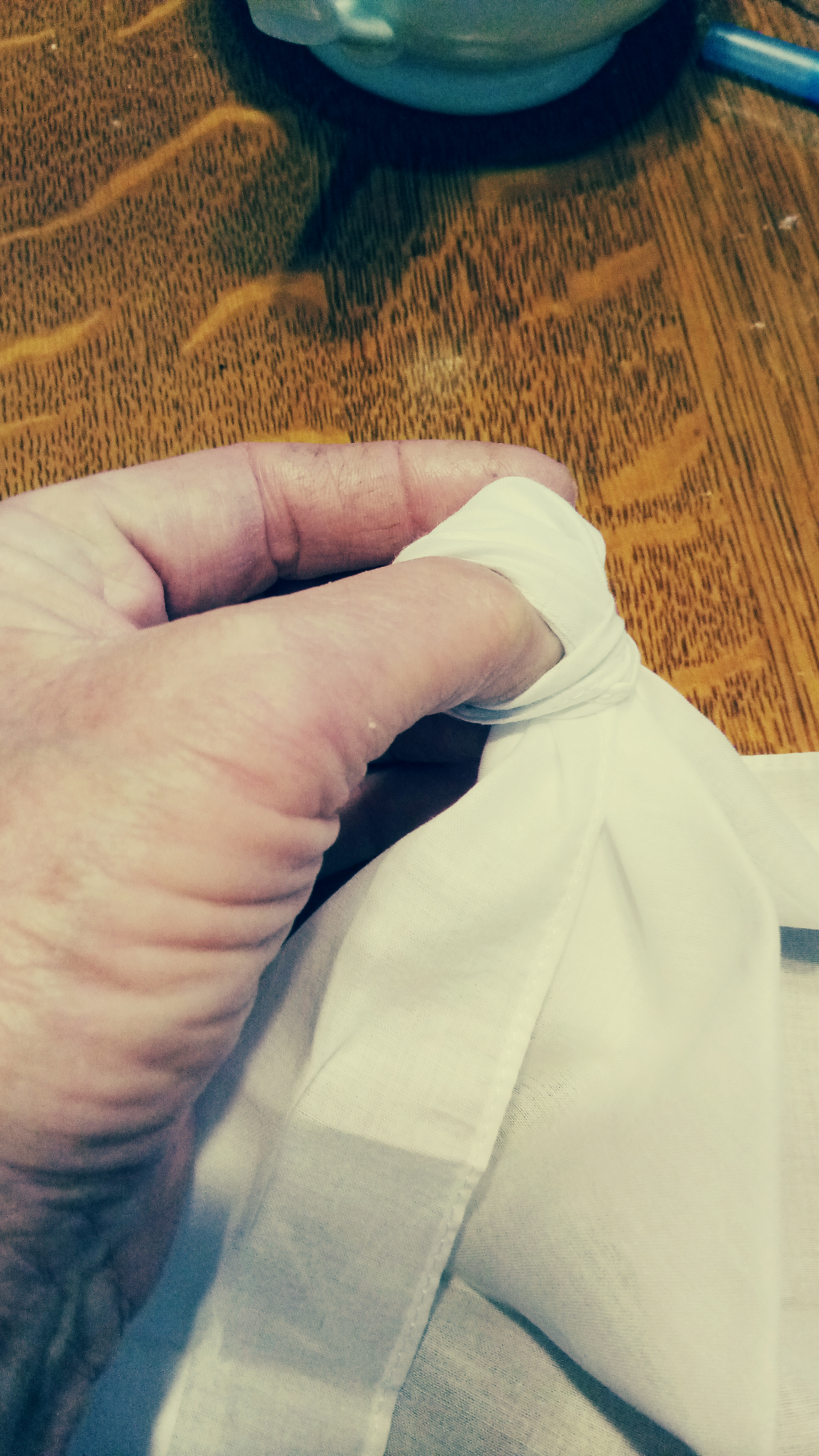 Tie an overhand knot in one corner, wrap the corner around a finger,