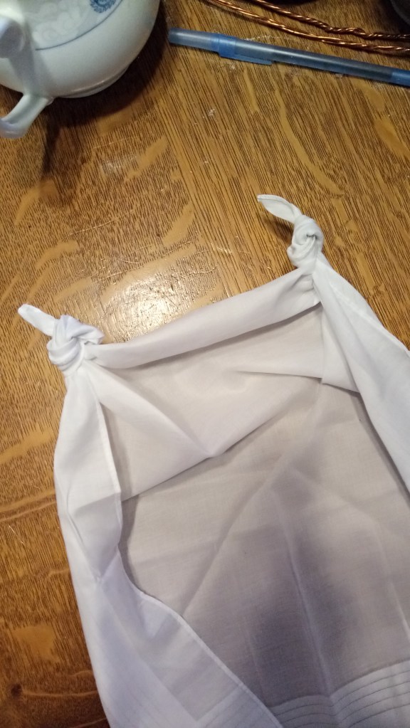 Or a bandana or a squarish piece of cloth about that size. So. You’re out, it’s hot, no shade and you need something on your head. This is just one reason you should always carry a cloth handkerchief…or bandana…or something of that sort. I first saw a hankie hat in a skit on Monty Python’s Flying Circus. I’ve always used them bandit-wise to keep dust out when cleaning or doing yard work.