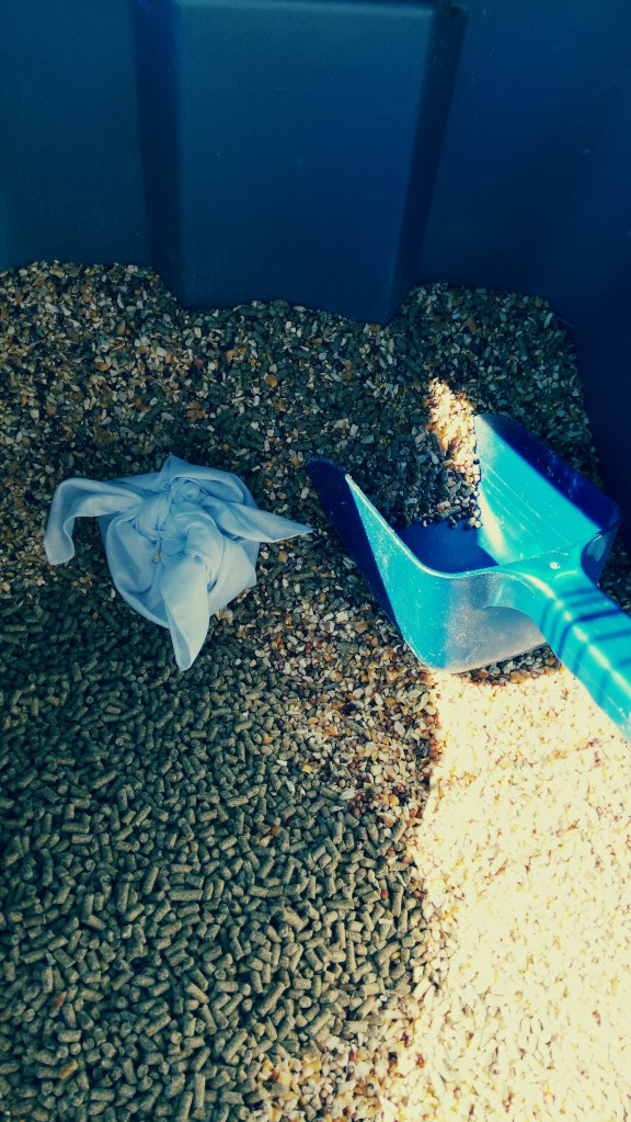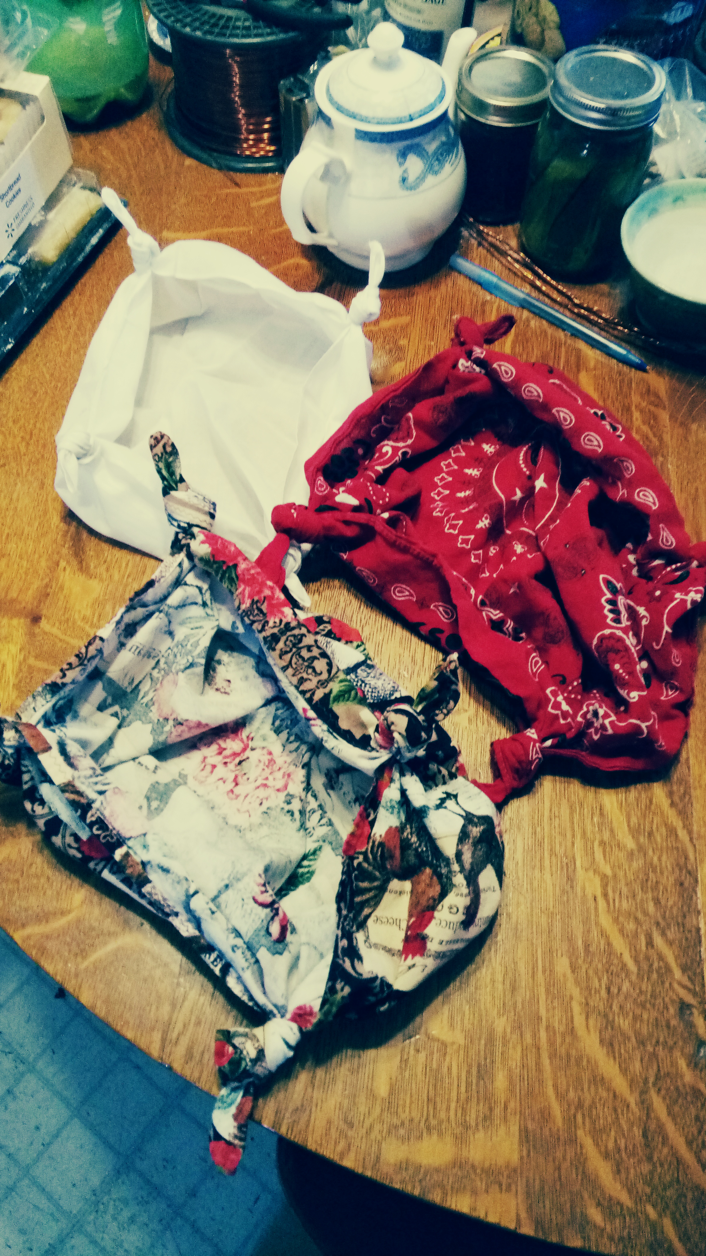 You can also tie it into a pouch to hold herbs (bay leaves) to keep bugs out of your chicken feed. You can do the same thing with sweet-smelling herbs to make a sachet for your drawers, too.