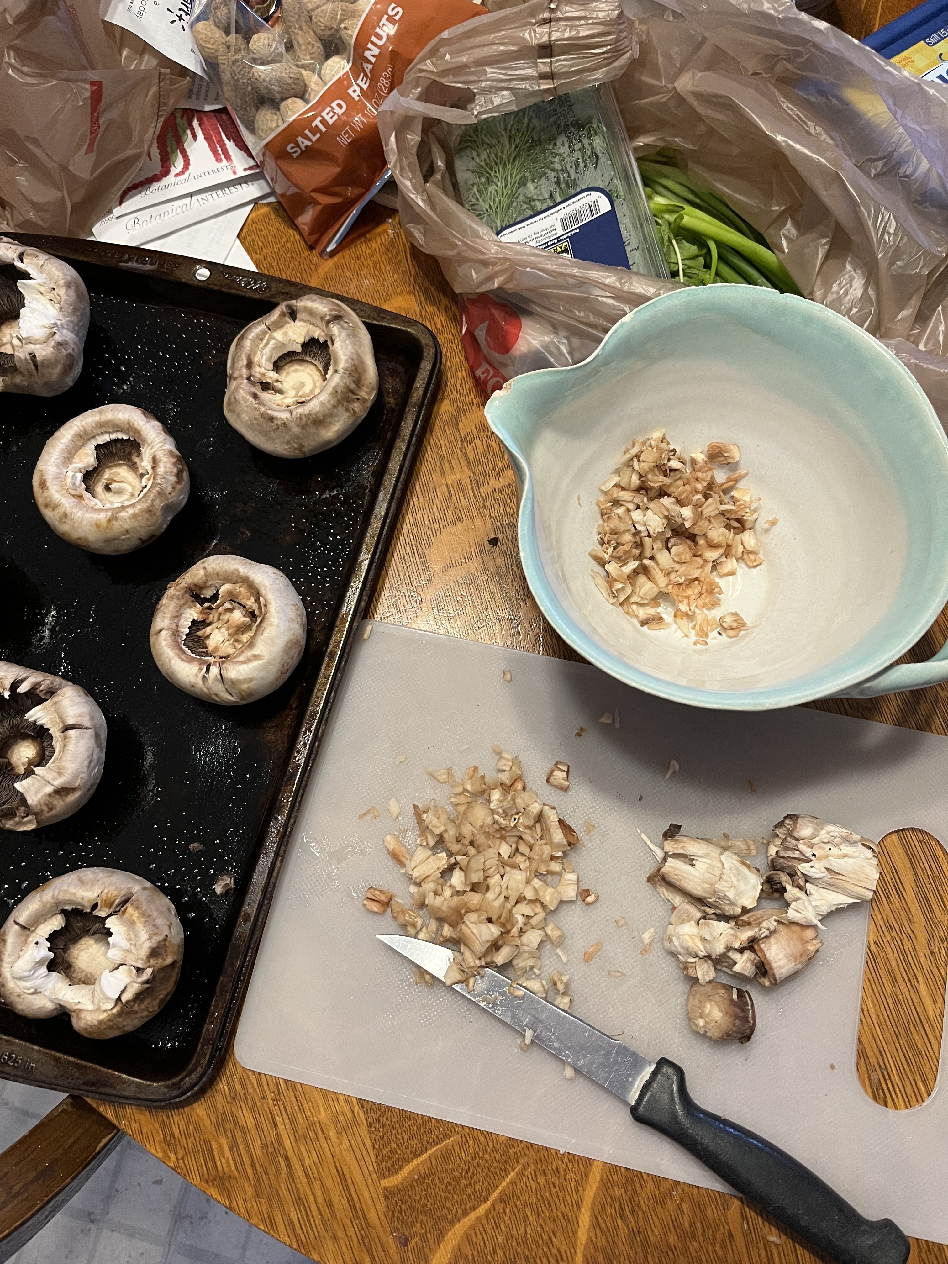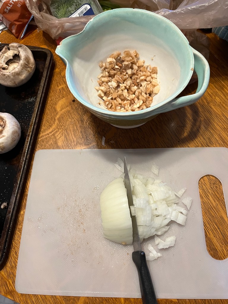 Mushrooms were on sale last night, so I grabbed a basket. Lately I’ve been getting sliced mushrooms because they’re faster for whatever I want them in and usually I just saute them with onions anyway, but I haven’t had stuffed mushrooms in SO LONG! I got the original recipe from a 1960s paperback vegetarian cookbook (something like Apples to Zucchini Vegetarian Cooking of something like that) but it’s been misplaced (I’m hoping it’ll show up at my daughter’s place?) but I made it so many times I’ll just wing it now.