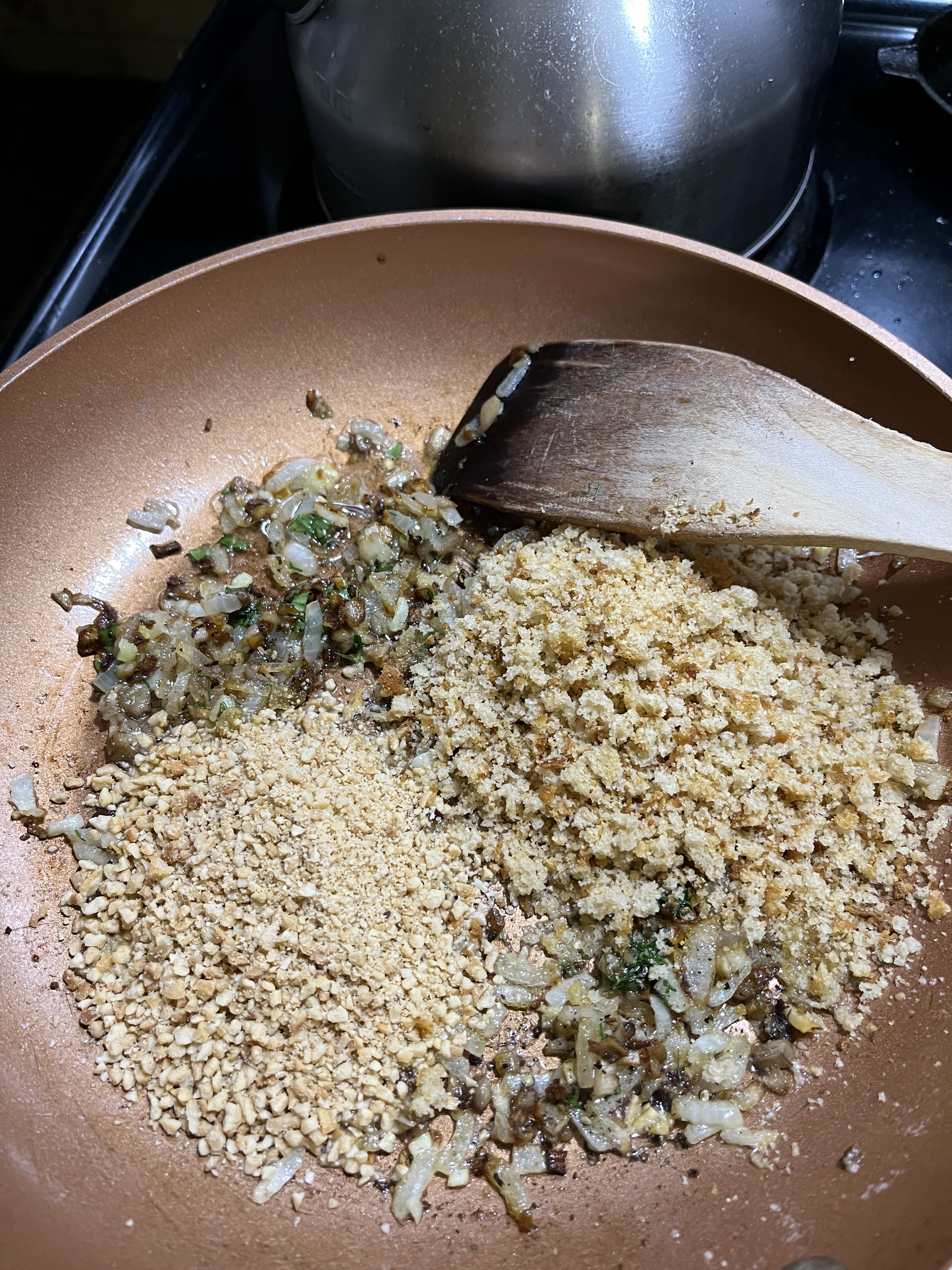 Turn off heat and add chopped nuts and breadcrumbs.