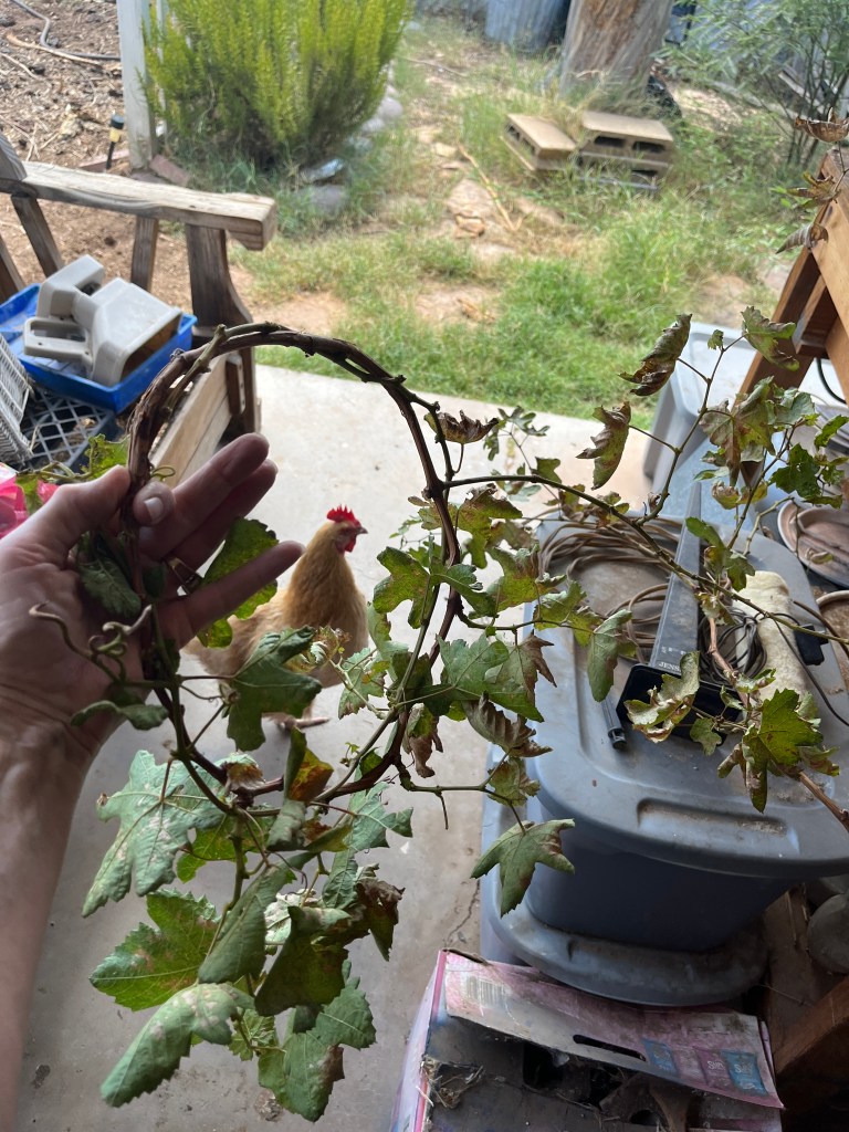 Repeat with the 3rd. Aggie and Chimie (pronounced Kimmy) came looking for Winnie…and any dropped leaves or whatever. If it’s full enough at 3, you can stop there. Up to you and your prunings.
