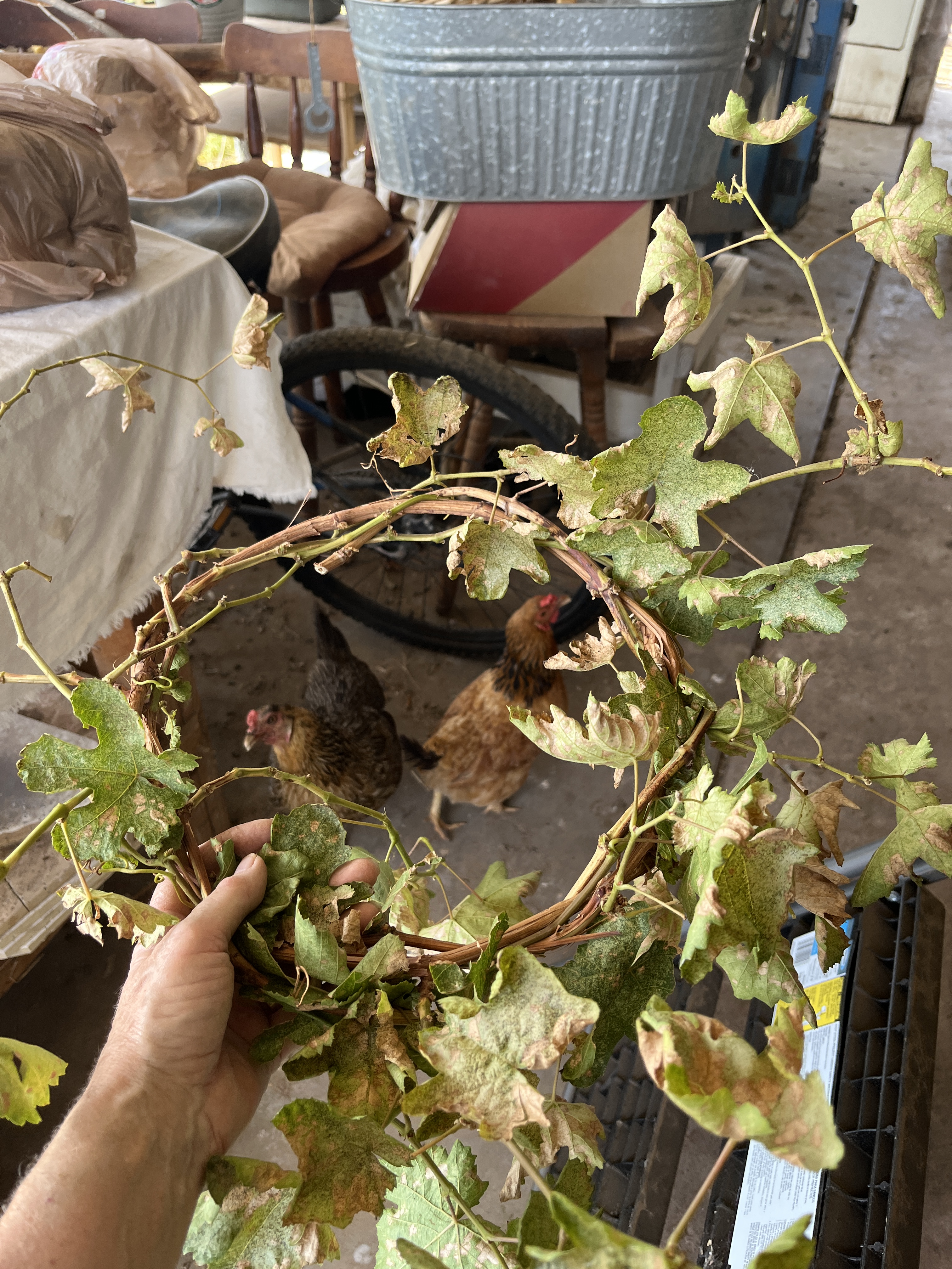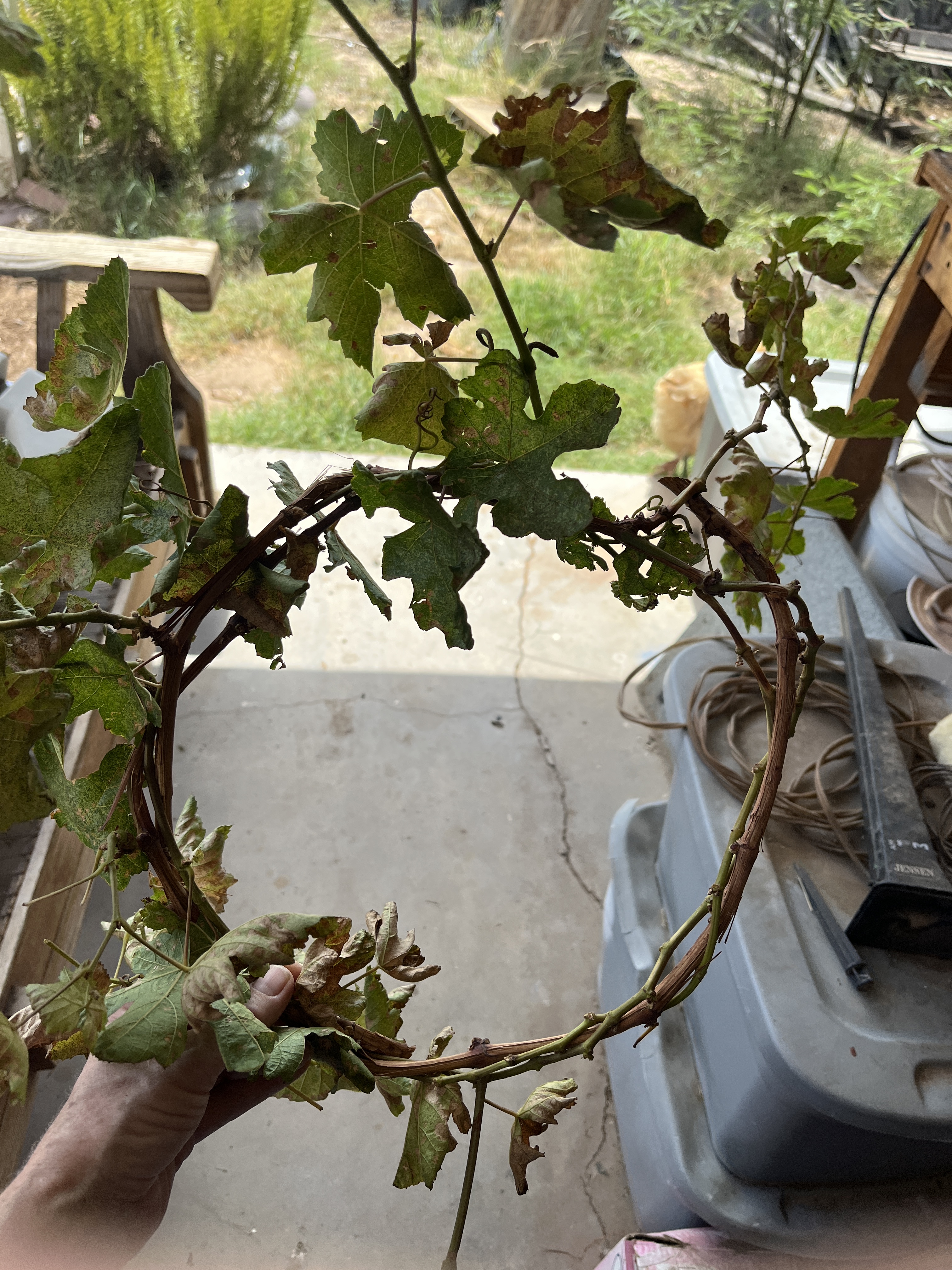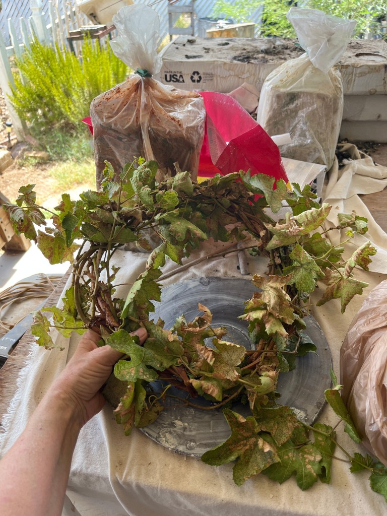 I had to prune my grapevine today so I made a wreath. Any viney or long, pliable plant can make a wreath. I’ve used evergreen prunings like junipers and confederate jasmine. You can try anything, some are easier than others. Grapevines seem to almost want to cooperate.