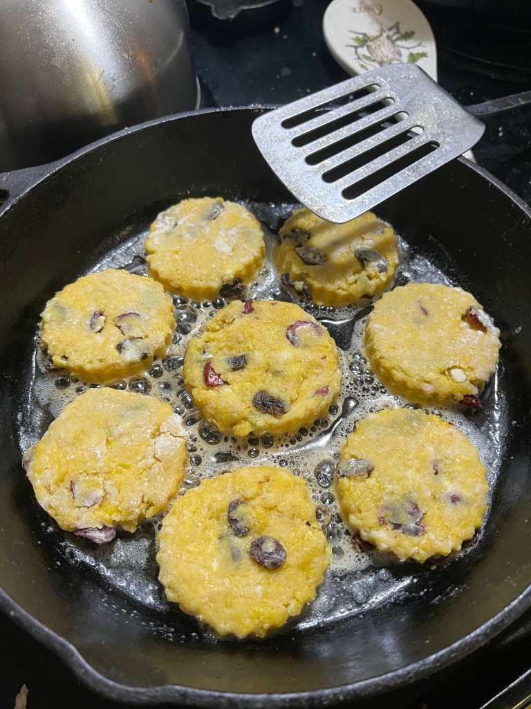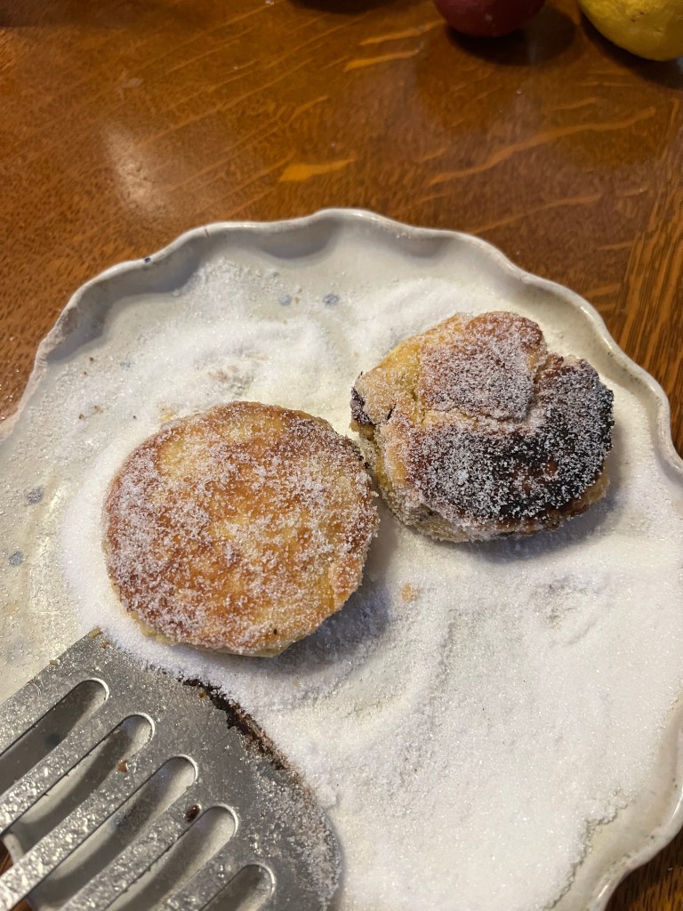 When they’re nicely browned dredge the warm cakes in granulated sugar. It’s OK if you want to skip this step and they’re probably easier to re-warm the next day without the sugar.