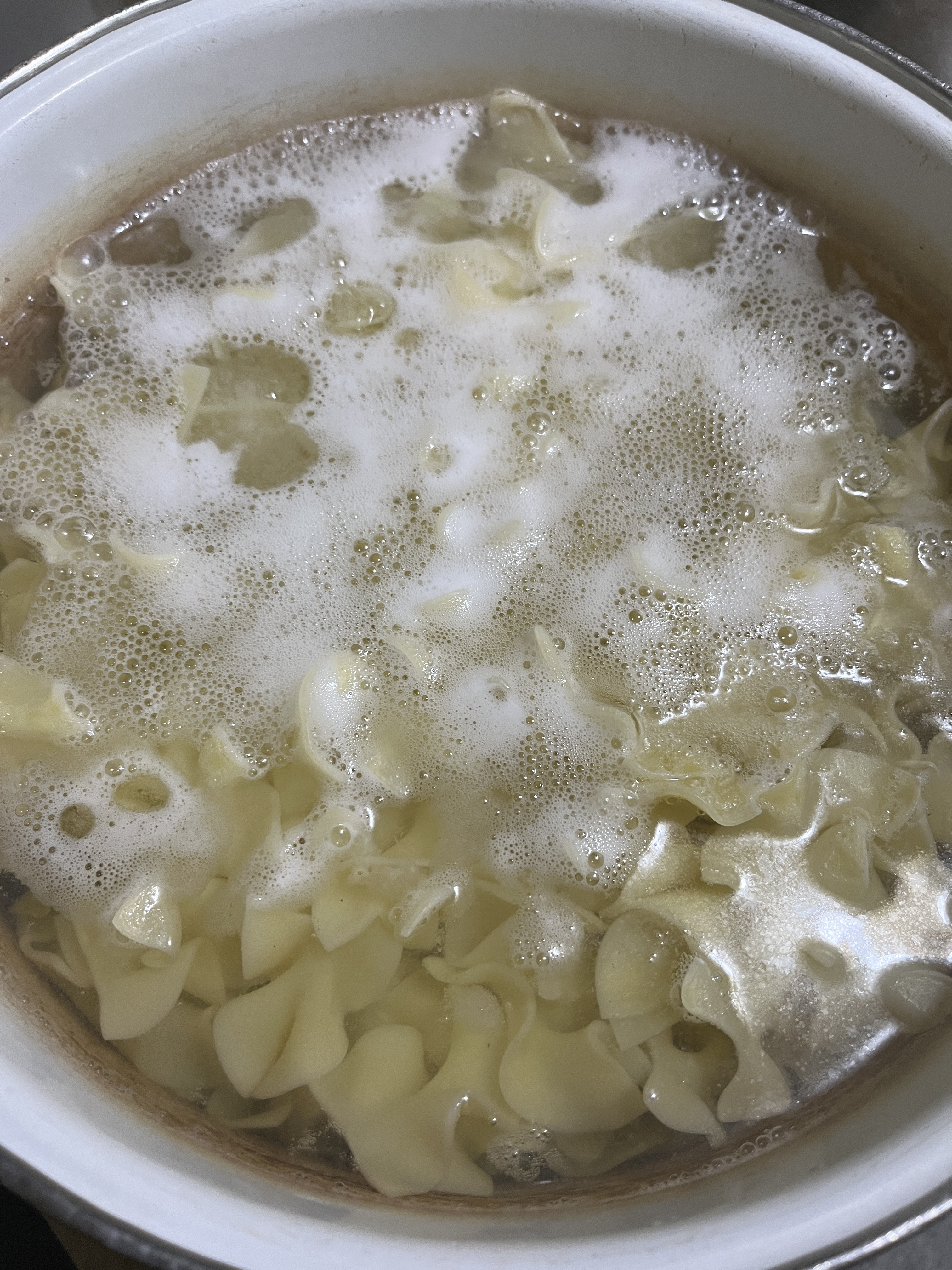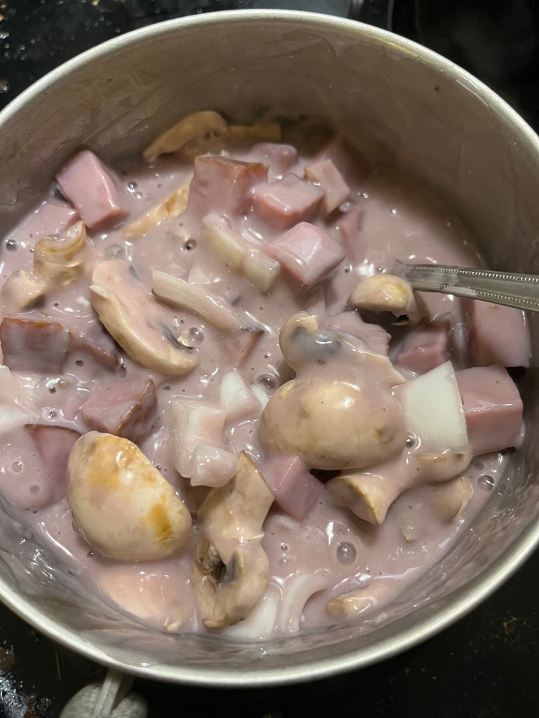 Put the cram of mushroom soup in a pan to warm up with 1/2 a can of wine. If you use red wine it’ll turn purple. This amuses me. Cut up some onion and celery and add it to the soup. Cube up a couple slices of ham and add them to the soup. If you have mushrooms needing to be used slice them up and add them, too.