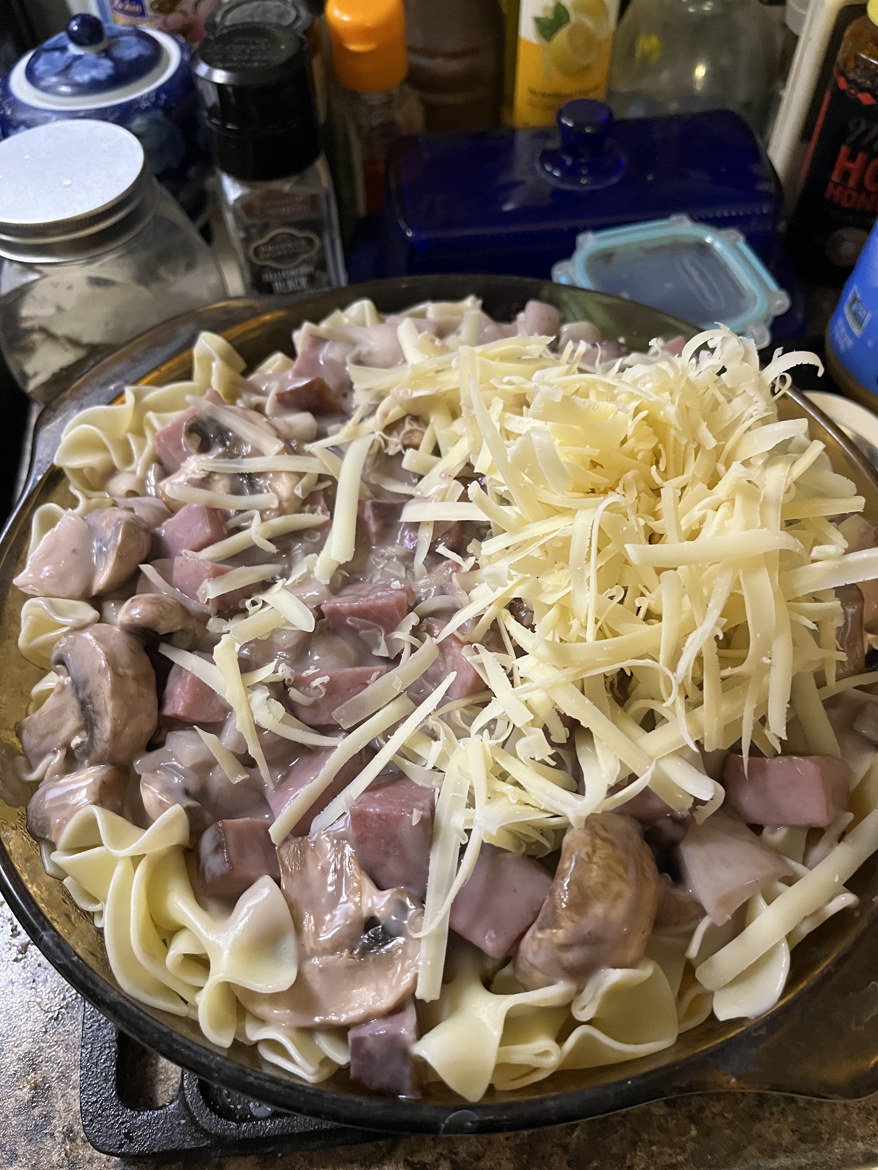 Put the soup and ham mixture on top. Yes, you caught me. I forgot to take the picture before I put some cheese on. I guess I’m just human and that’s OK.