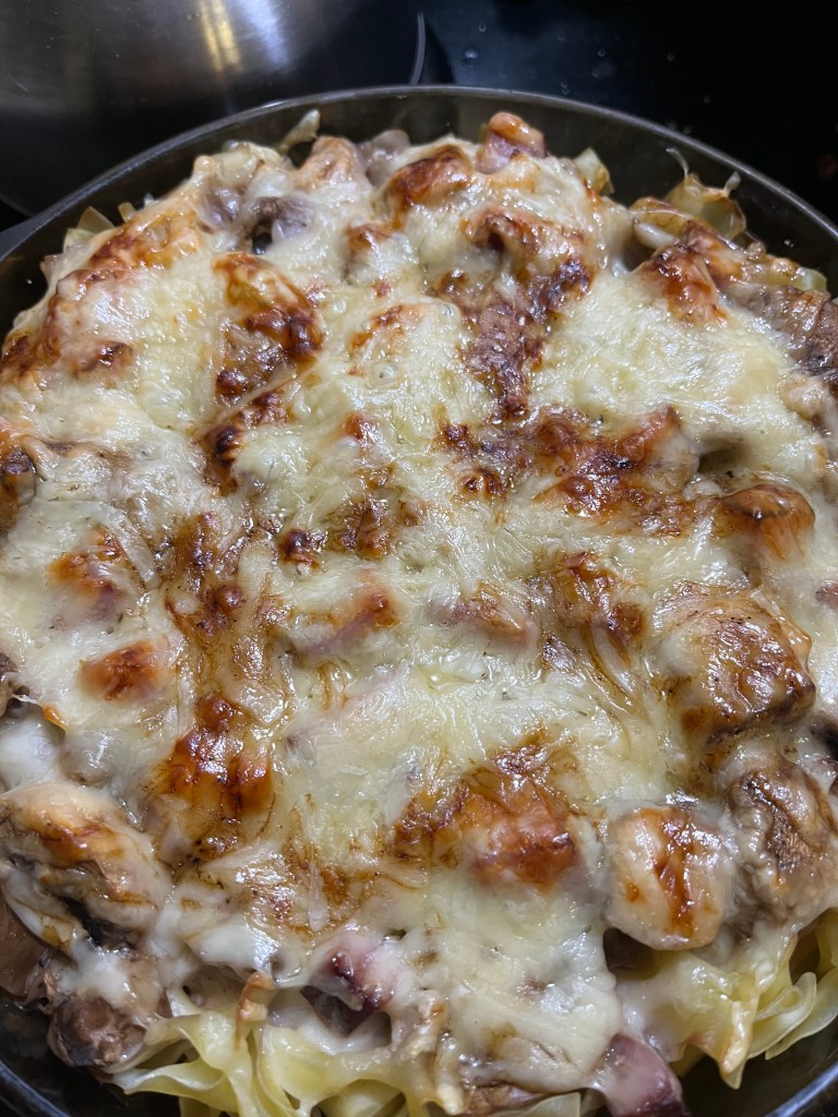 Bake at 350 for 20-30 minutes or until the cheese is melted or even slightly browned…to your liking. You’re the cook, after all. That’s the best thing about cooking, you can make it any way you want. The brown spots on this one are Worcestershire sauce. I forgot to put it in with the soup. Turns out I rather like putting it on after the cheese, so I might just keep doing it this way.