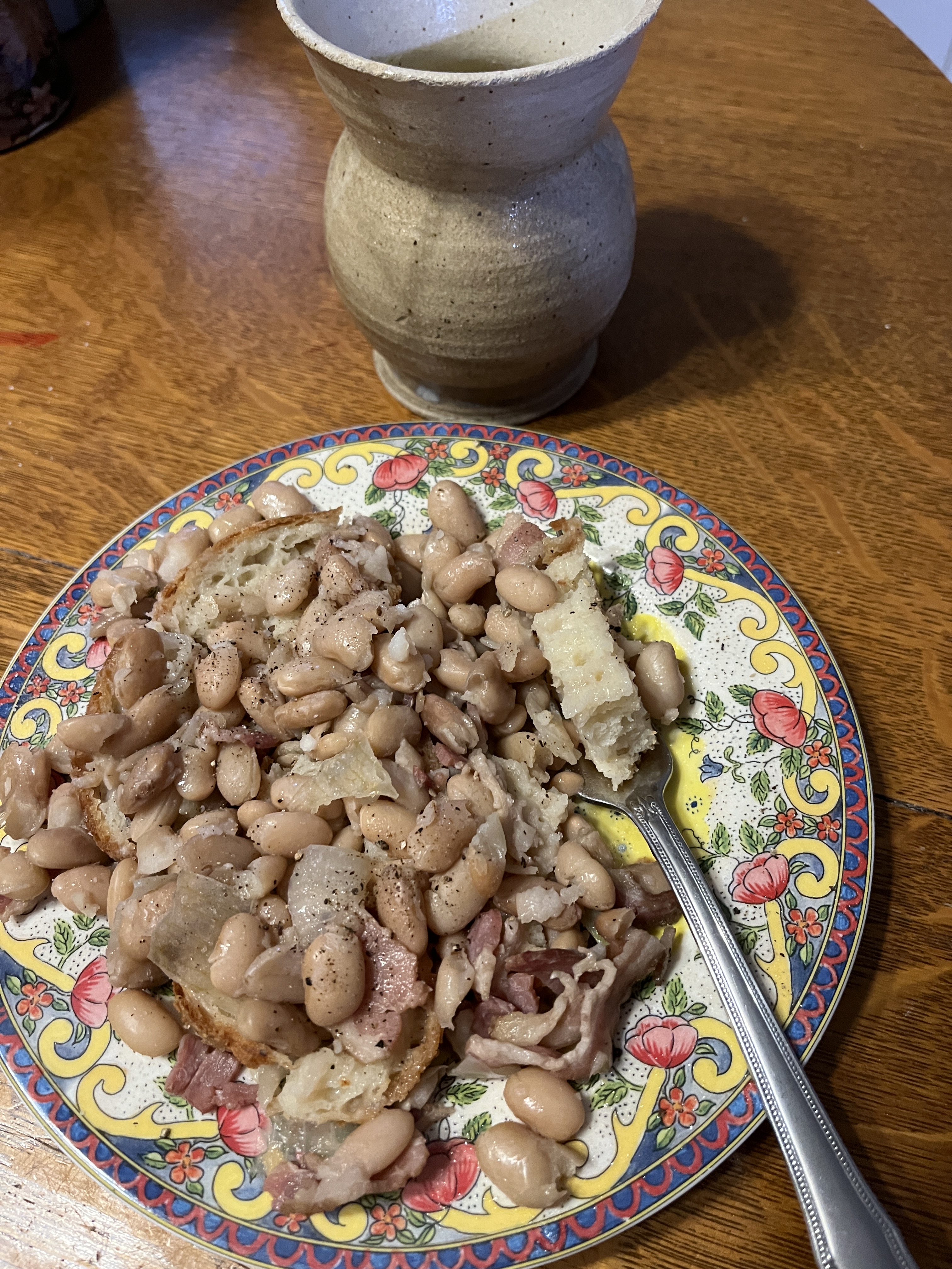 When I was a kid Dad would sometimes make a pot of beans. Let it soak overnight, turn it on to cook 1st thing in the morning and have beans on buttered bread or toast for a satisfying early lunch. YUM! Grand memories! And then there’s the leftover from THAT to use! Pull some out for chili for that night’s dinner with leftovers for lunches, more yum!. Then make baked/BBQ beans to have with another dinner, yet more yum! Then, with the last bit, make refried beans for yet another fabulous meal with tacos, enchiladas (remember the chicken leftovers?), tostadas, burritos…so many options! And if there’s still more beans left over there’s always soups and stews to add them to with other leftovers. I kind of grew up with this leftover life.