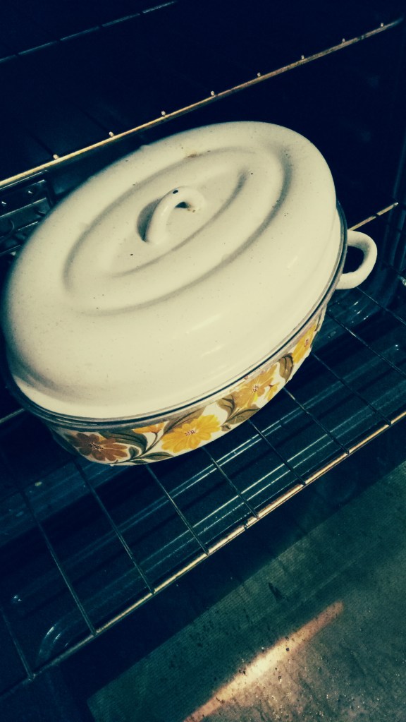 I set the butter and chocolate to melt, then put on a pot of rice and chopped an onion. Once the butter and chocolate had melted I finished putting together brownies and put them in the oven. Then I mixed up the meatloaf in a big bowl. Before putting the meatloaf in the loafpan to bake I pulled out 2 handfulls of meatloaf mix, tossed them in a pan to scramble, made 2 hamburger patties and THEN put the meatloaf in the pan to bake as I pulled the brownies out, setting them aside to cool. As the meat was scrambling/browning I put the rice in a casserole and once the meat was brown put 1/2 of it on top of the rice, opened a can of spaghetti sauce, put it on top of that and put a bunch of shredded cheese on top before popping that in the oven with the meatloaf. Then I put a can of vegetable beef soup in with the rest of the scrambled meat, rinsed the can with wine and added Worcestershire and other flavours to make filling for my lunch pasties. As that simmered down I fried up the hamburgers, added whatever cheese we felt like that night (cheddar, Gouda, Swiss, provolone…), made a quick wine reduction from the pan drippings to pour over the burgers and sat down to dinner. I might have tossed some frozen tater tots in the oven earlier with the brownies…they’d be nice, too, but not essential. After dinner I finished making lunches and we finished our visit as I portioned the casserole out into single-serving containers to freeze for later meals. The next day I had meatloaf for dinner with mashed potatoes and a salad from the garden. The night after that I made stroganoff from the meatloaf leftovers (cut up) with cream of mushroom soup, a little wine and Worcestershire sauce (again). Sometimes I mix in a little Kitchen Magician or other caramelized browning aid to make it darker. Instead of serving over noodles I just mix it all in with the boiled and drained noodles as a one-pot dinner. Sneaking in some peas or broccoli doesn’t hurt but isn’t necessary. The leftovers from this ate put into single-serving containers and frozen for later meals.