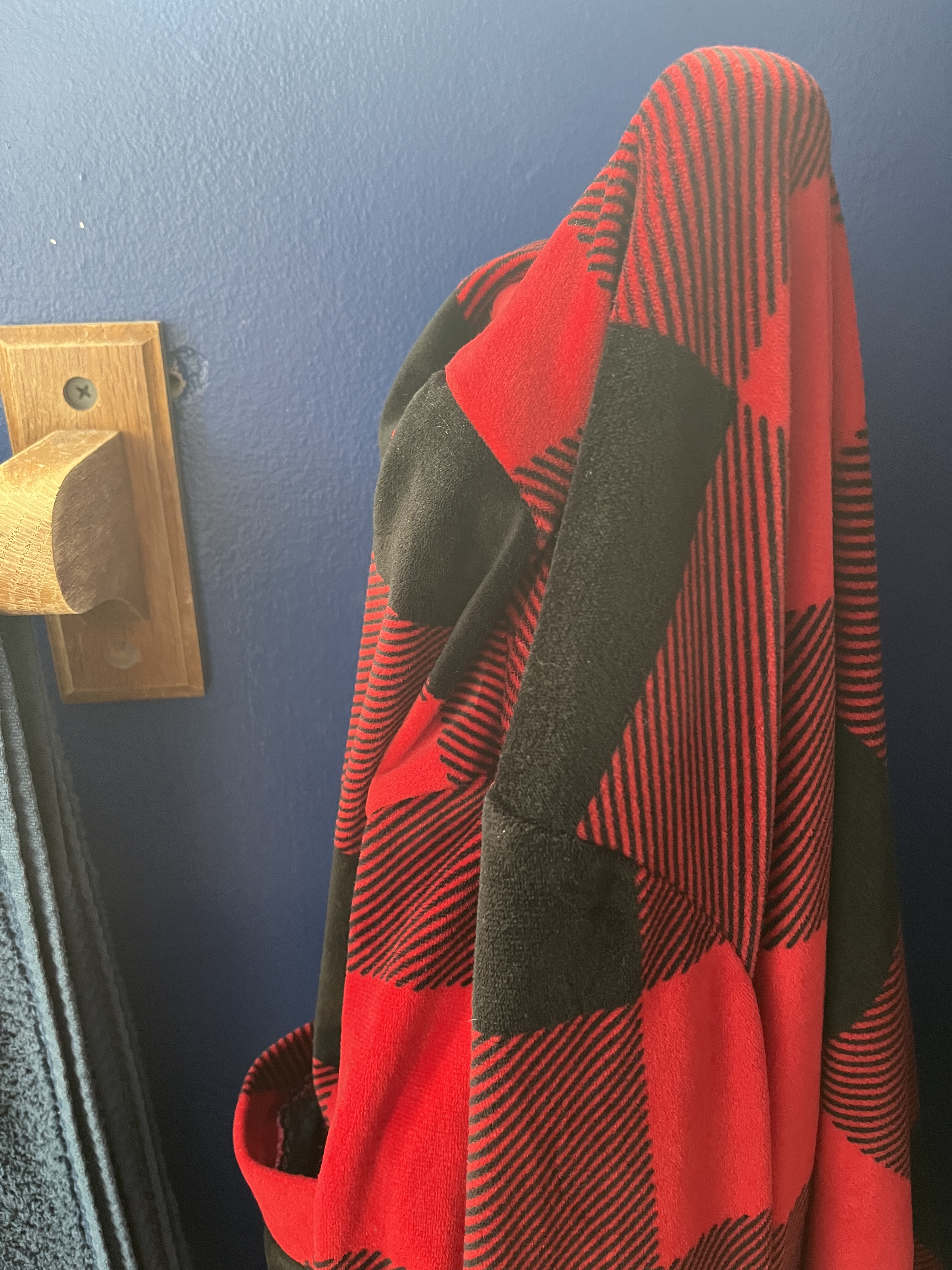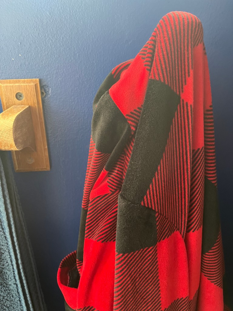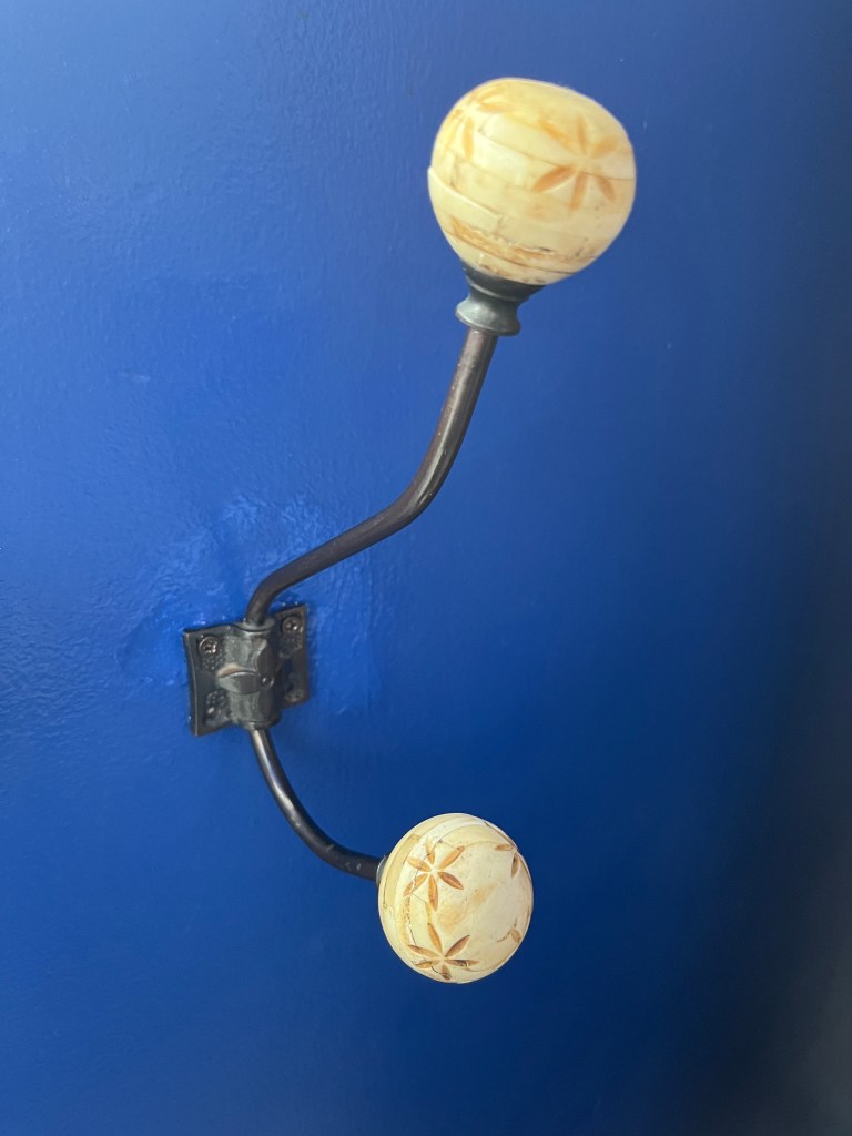 A couple years ago my bathroom had a back up that lead to it being totally gutted and redone along with half the adjacent bathroom. It was an interesting year. I’d had this clothes hook on the front of the shower stall but now the tiles prevented that. The only place I could manage was between the door and the towel bar. I started but got called away mid job and then life happened and a new roommate who worked from home so the noise was problematic and, well, stuff. So I finally managed to clear space and time to do it!