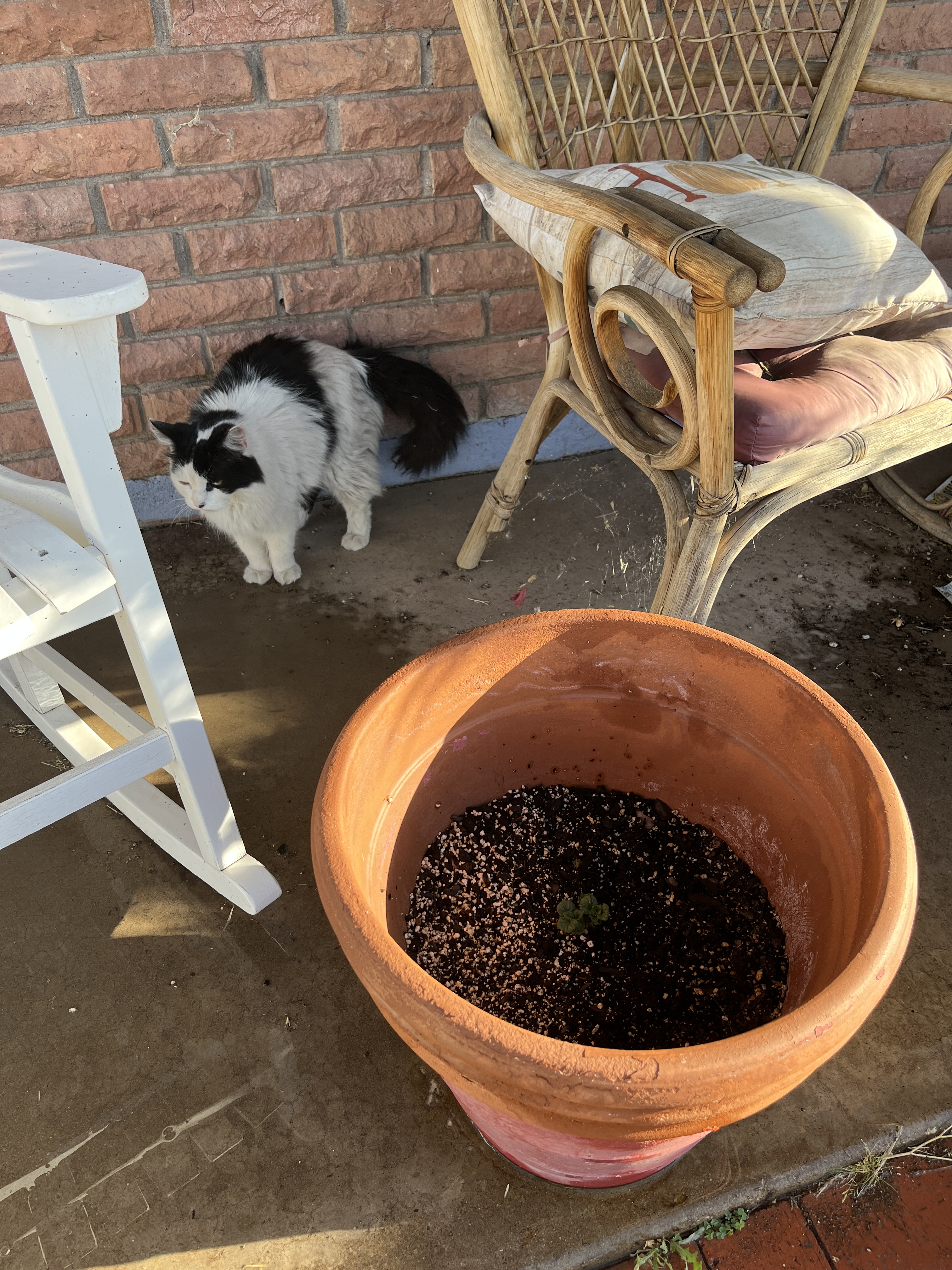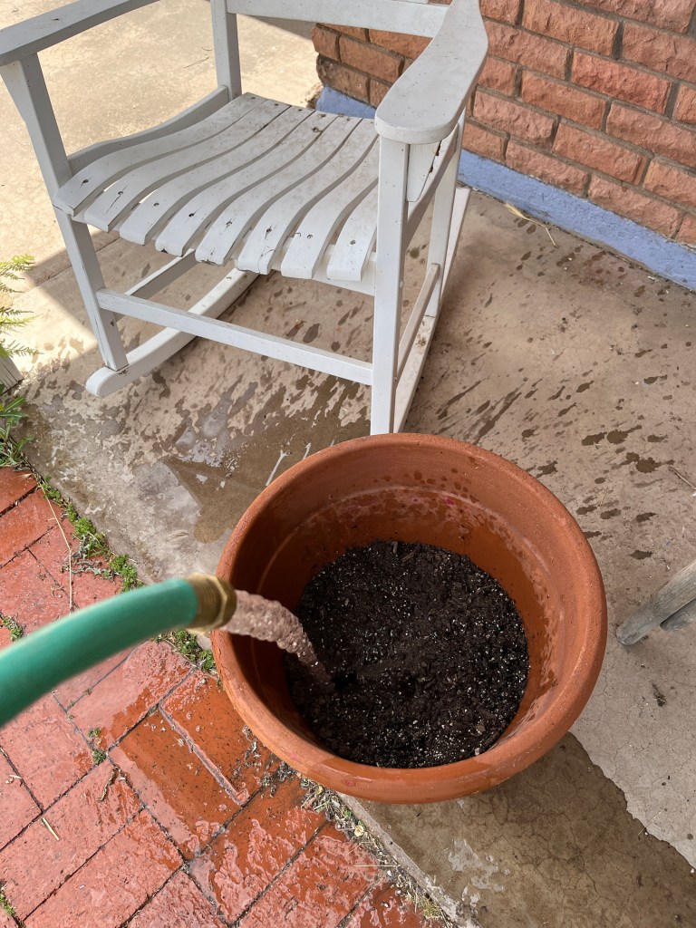 First I hosed off the big pot and put it where I wanted it to grow. It’ll get morning sun and open shade the rest of the day and will be convenient to water while not being in the way.