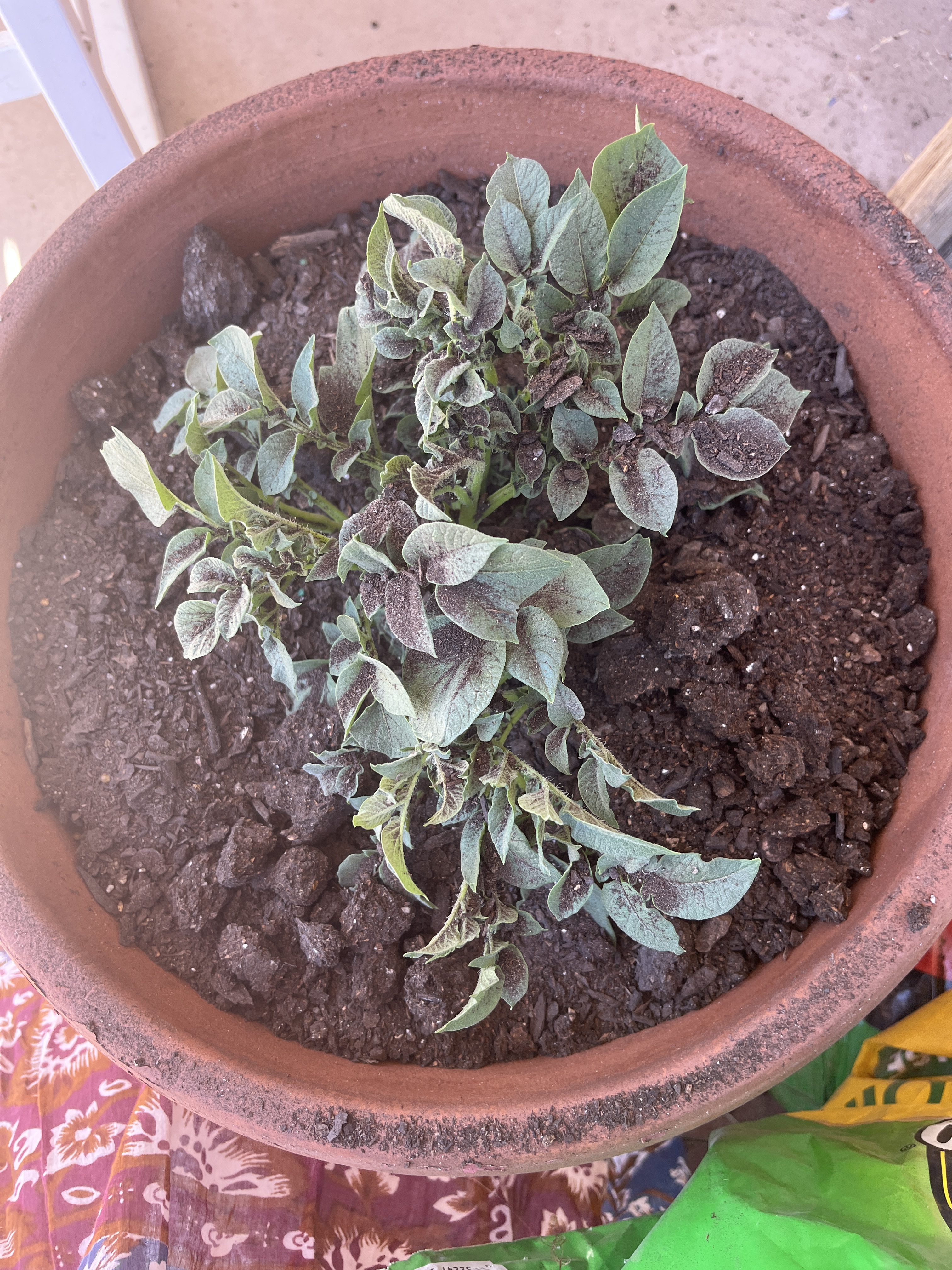 The spuds have grown enough to add more soil. I only filled it to the point of not covering the shortest/smallest sprouts, then watered it well. The potting soil soil was really dry so it floated and got on the foliage. That won’t hurt anything and it’ll wash off at the next watering.