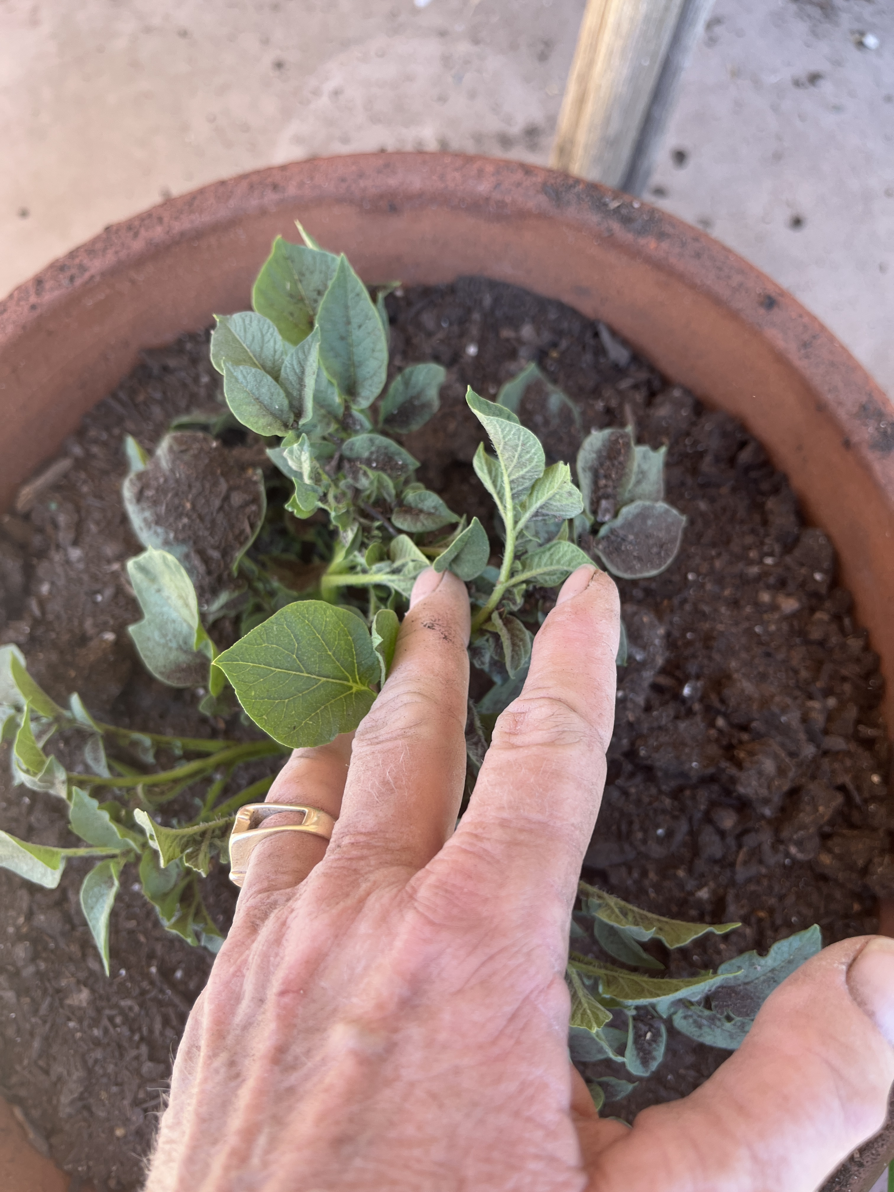 More potting soil, burying the potato by about 2 or 3 inches so it’s comfy and can start really growing.