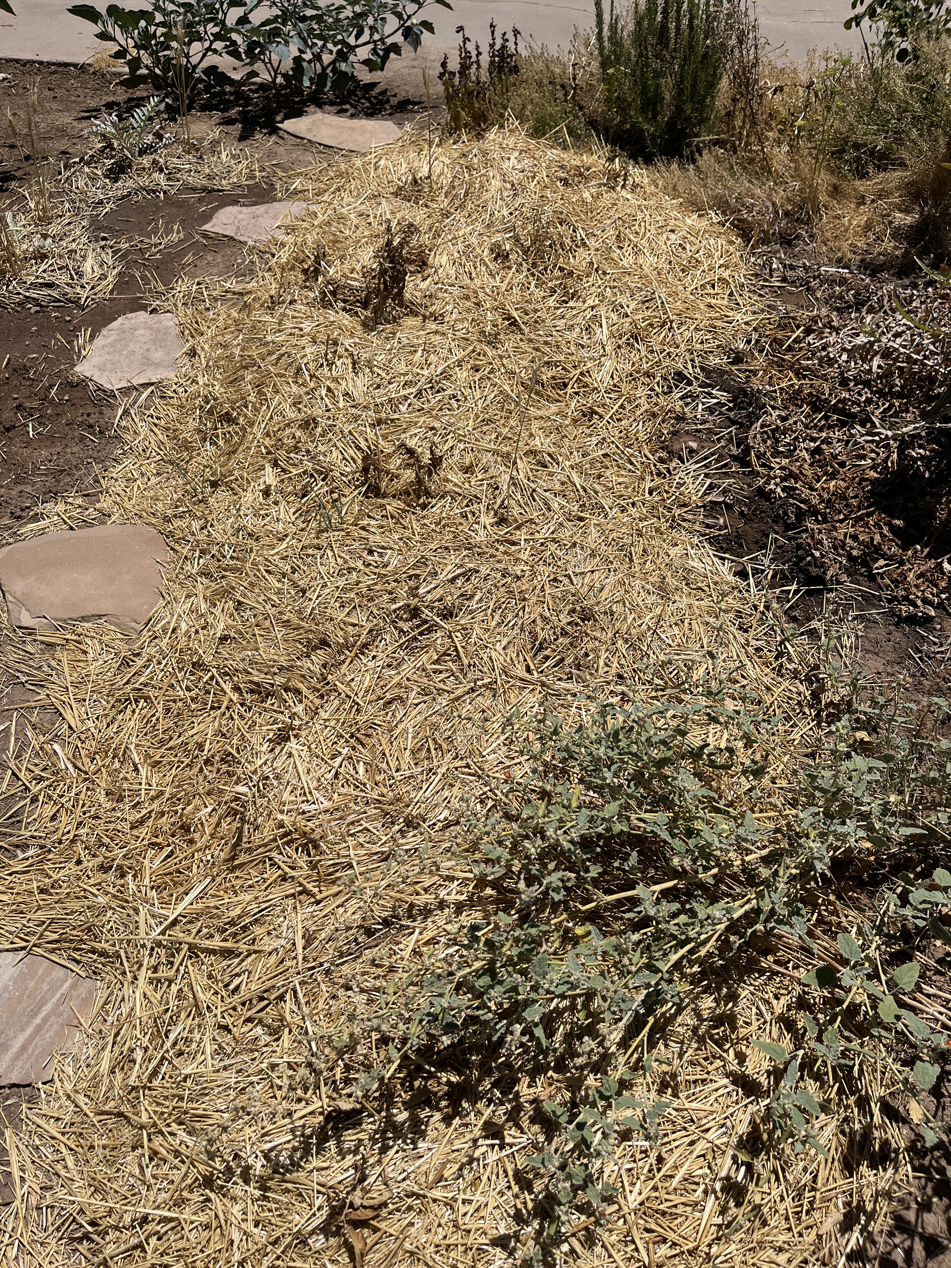 These are the ones I bought and put in in April, hoping for am actual harvest. he heat came on too soon and too strong this year. At least the datura (that I didn’t plant) is doing well behind it, as is the rosemary and Don Juan rose that you can barely see some leaves in the top left corner. The dead stuff on the right side is the artichoke dying back for the summer. It usually comes back in the fall. The sprawling grey-green thing in the bottom right corner is a globe mallow that came from native wildflower seed that I scattered 2 years ago. It and lupines are among my favourite desert wildflowers and I’m hoping for a nice show out front next spring.
