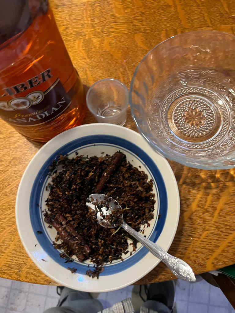 This is a recent potpourri that I just freshened with Canadian bourbon. I put the cinnamon sticks in a bowl, poured a shot of bourbon over them and let them soak for a bit before mixing in the tobacco. I just tossed the old rosemary sprigs and spent jonquils from February. This is 1/2 oz of Black Cavendish and 1/2oz of Nutty Irishman. It’s been out for a few months so the now-dry tobacco and cinnamon sticks will soak up the booze and be like new.