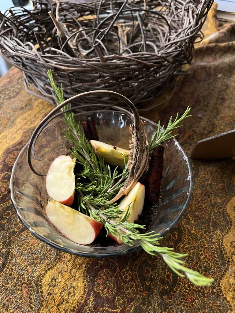 After a bit I turned the tobacco back into the pretty bowl I use and arranged the cinnamon in with a few fresh rosemary sprigs for a nice piney note, apple wedges for freshness and a few cloves just for fun spice. Yes, that’s a devil’s claw in there, too, just for fun. In the past I’ve even added leather and wood chips to potpourris. Whatever you have handy that you think smells good should work. If, for some reason it doesn’t work you can toss it into the compost and start over. Using things from your garden and kitchen makes it all fresher and healthier. You know where it all came from, it’s not synthetic scents from a laboratory somewhere, random plants treated with colours and preservatives or other little trinkets that might look pretty for bulk but you don’t even know what it is!