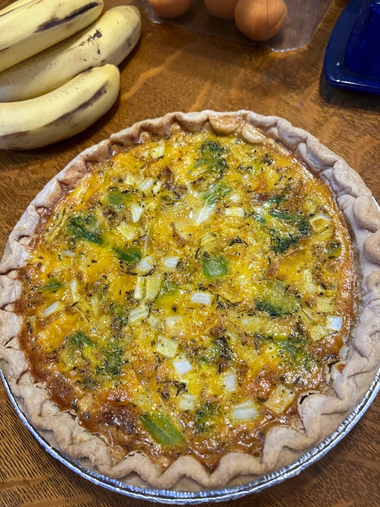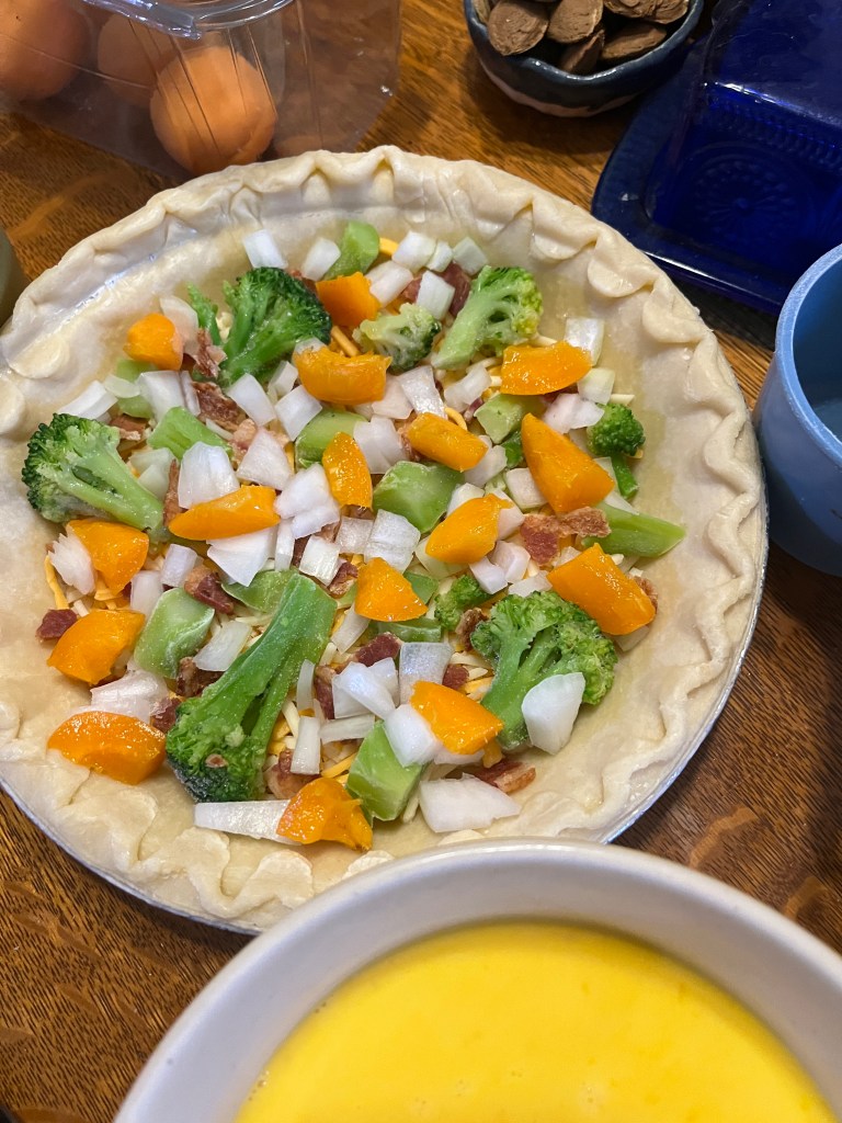 Layer the cheese in the pie crust (I used a deep dish crust) with vegetables (broccoli and onions here) and meat (I used bacon but had rotisserie chicken, too, just decided against it). This time I cut up and added an apricot because I had it and they work well in savory things, too. As you can see, this is a good way to use up leftovers that aren’t plentiful enough for a full meal. Use a couple different cheeses, chicken with ham or bacon, whatever vegetables you had in the last couple nights. Asparagus is especially nice and decorative.