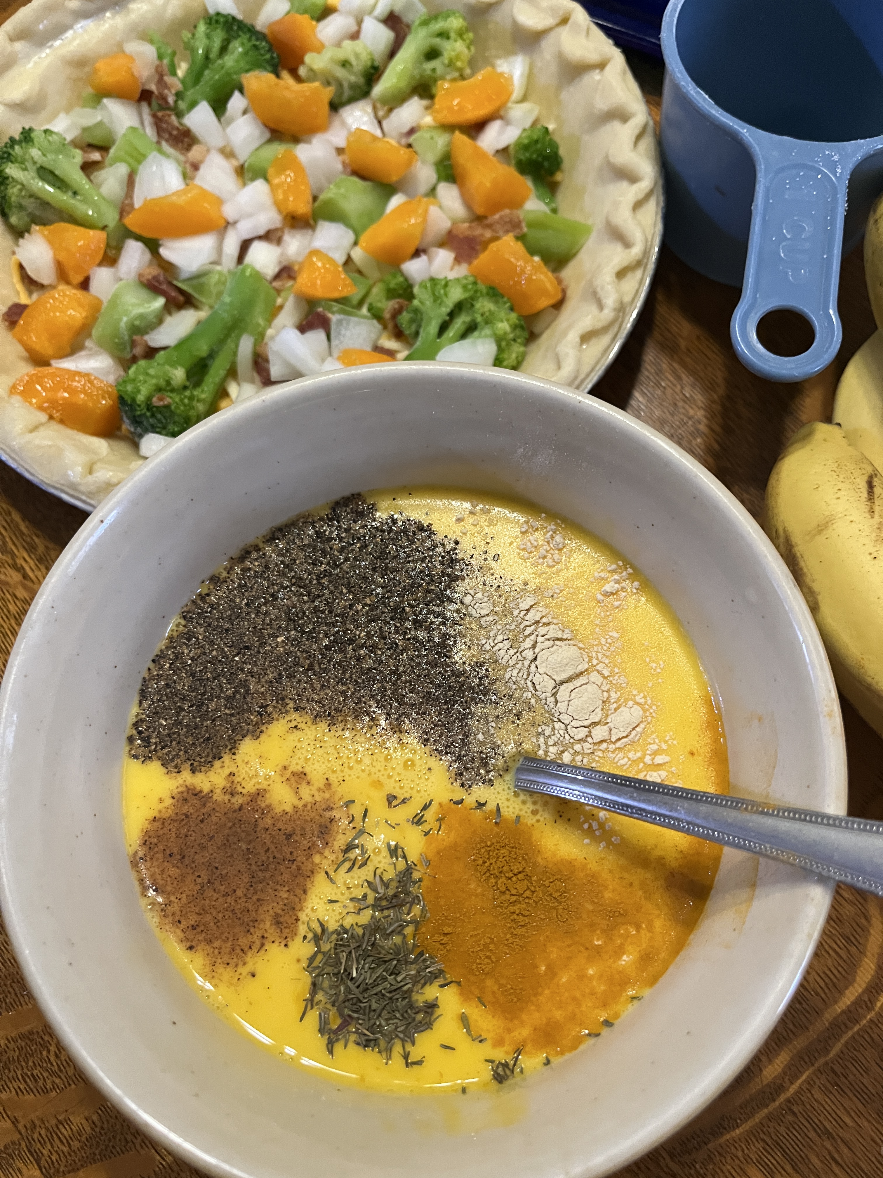 Scramble up 8 eggs with about 1/4c milk. I used a couple Tablespoons of heavy cream, too. The spices are, from the fork handle clockwise: turmeric, thyme, nutmeg, pepper and garlic.